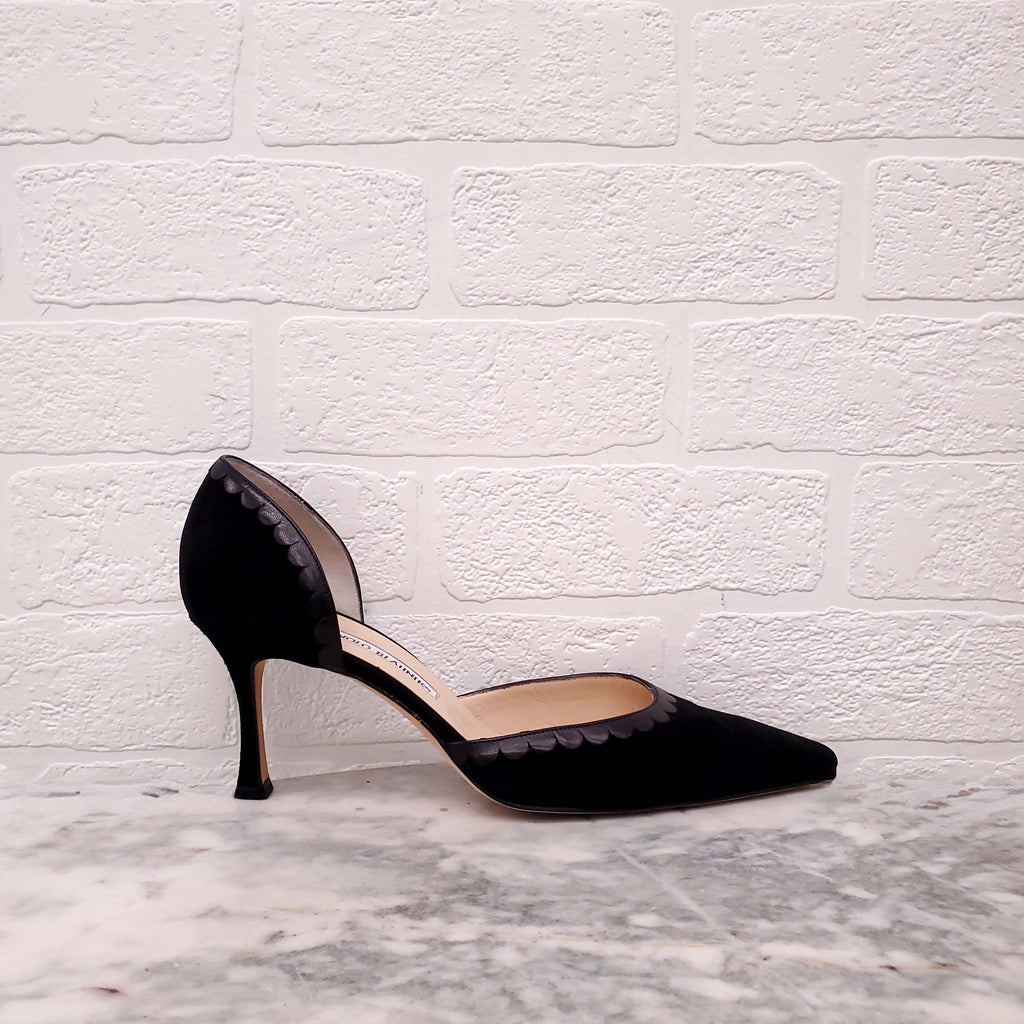 MANOLO BLAHNIK BLACK SUEDE KITTEN HEELS WITH LEATHER SCALLOPED DETAIL - SIZE 38