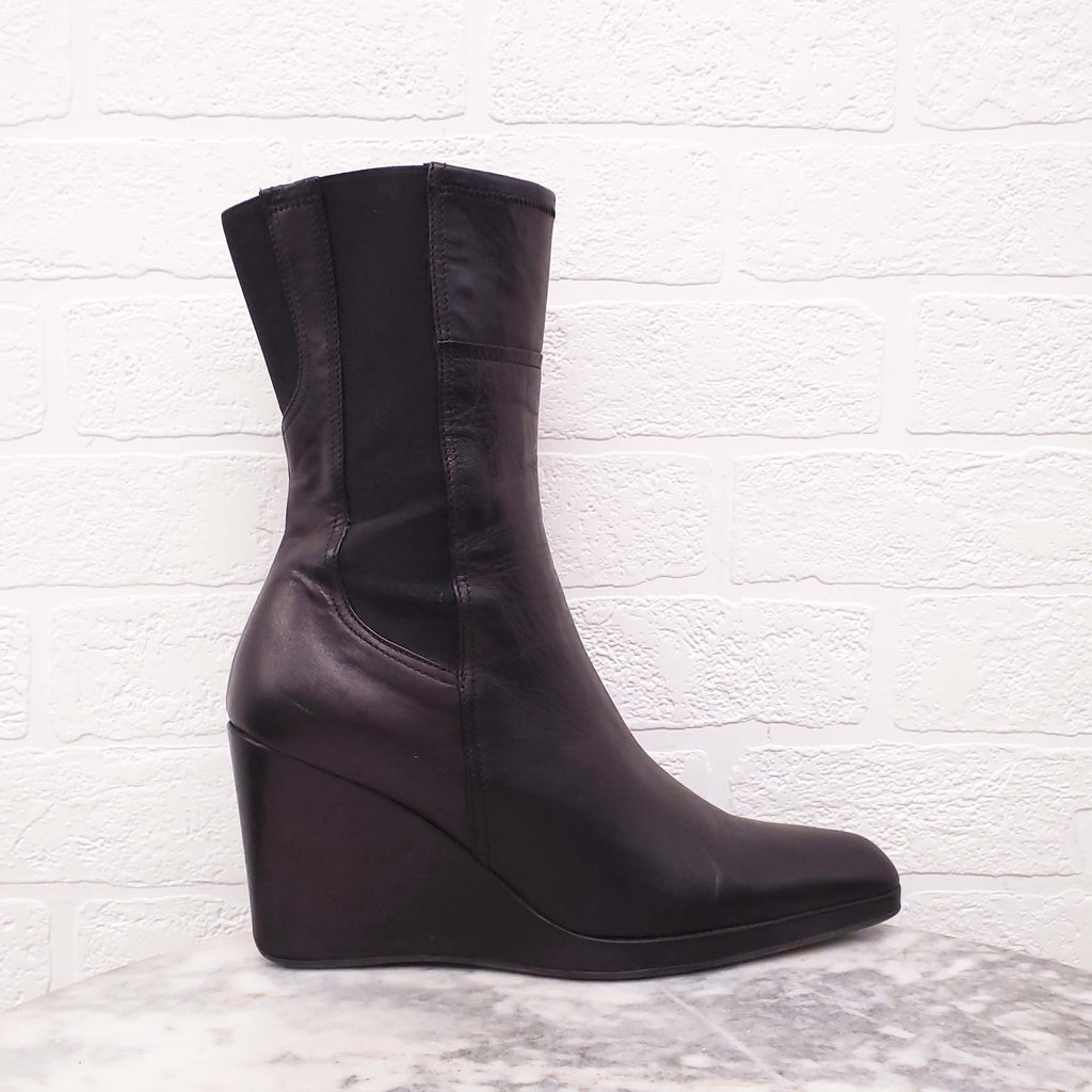 PRADA BLACK LEATHER WEDGE BOOTIES WITH LOGO ZIPPER - SIZE 38