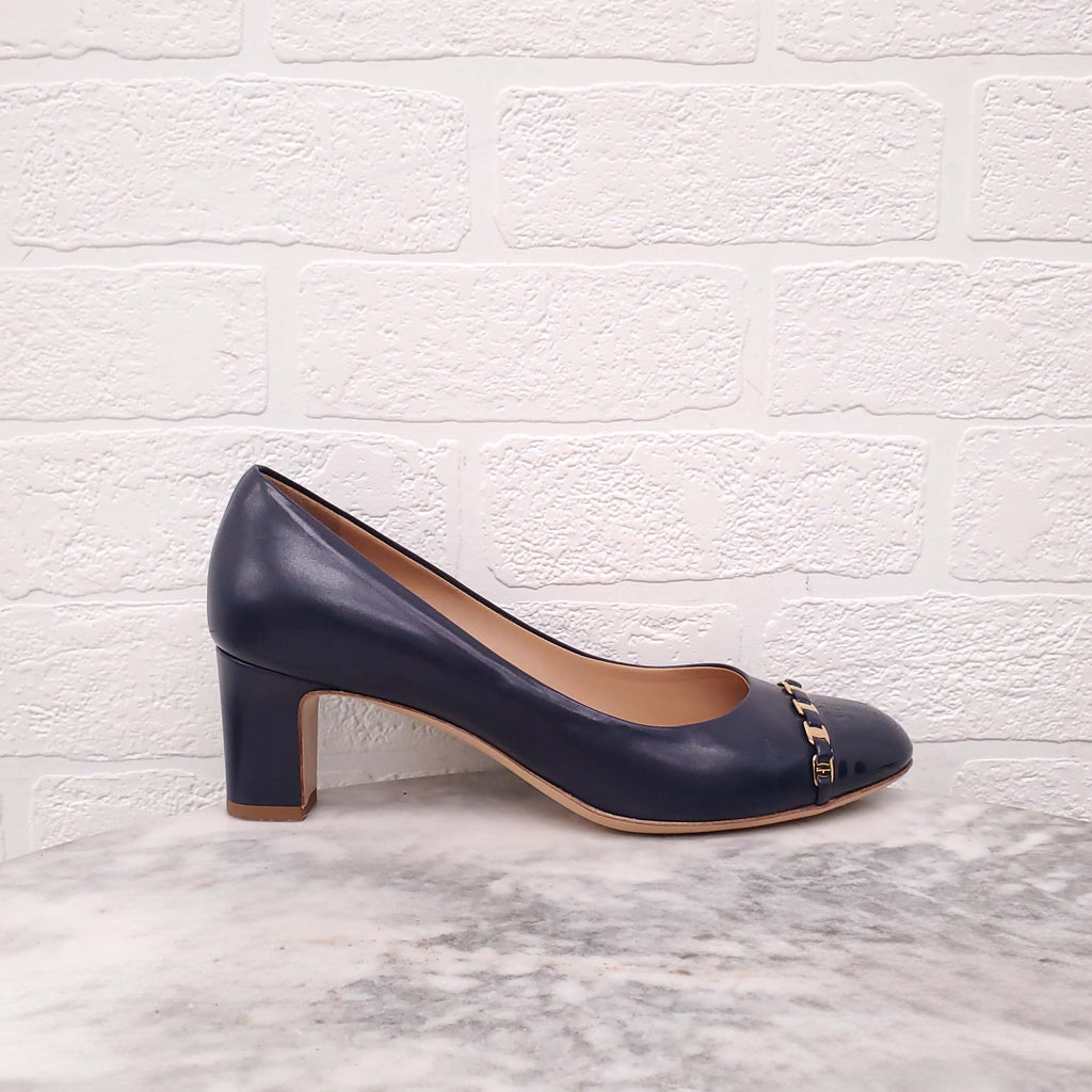 SALVATORE FERRAGAMO BLUE LEATHER CHAIN LOGO KITTEN HEELS - SIZE 7.5