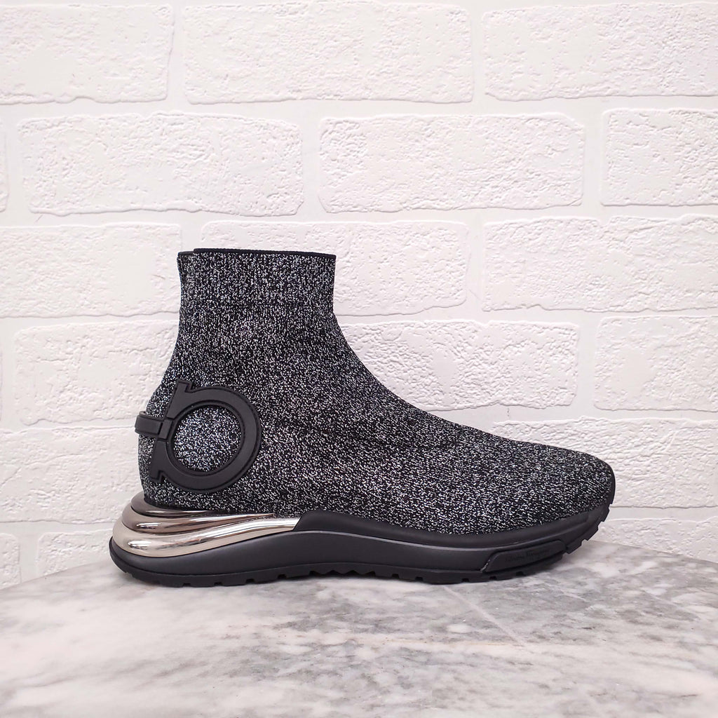 SALVATORE FERRAGAMO SILVER 'GANCINI' LOGO SOCK SNEAKERS - SIZE 8