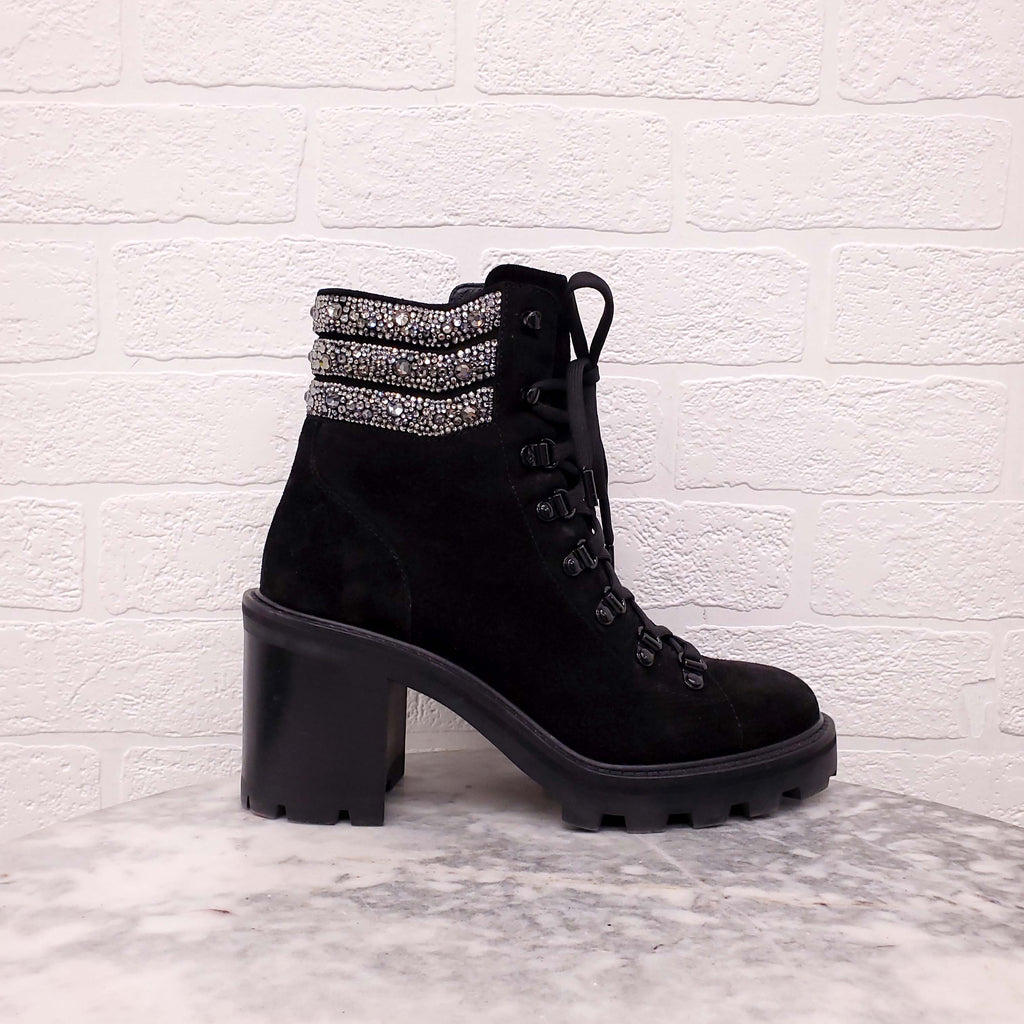 JIMMY CHOO BLACK SUEDE MOTORCYCLE BOOTS WITH CRYSTAL CUFF - SIZE 39