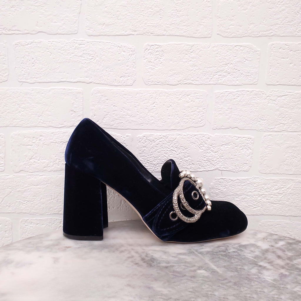 MIU MIU NAVY VELVET LOAFERS WITH BLOCK HEEL AND PEARL BUCKLE DETAIL - SIZE 38.5