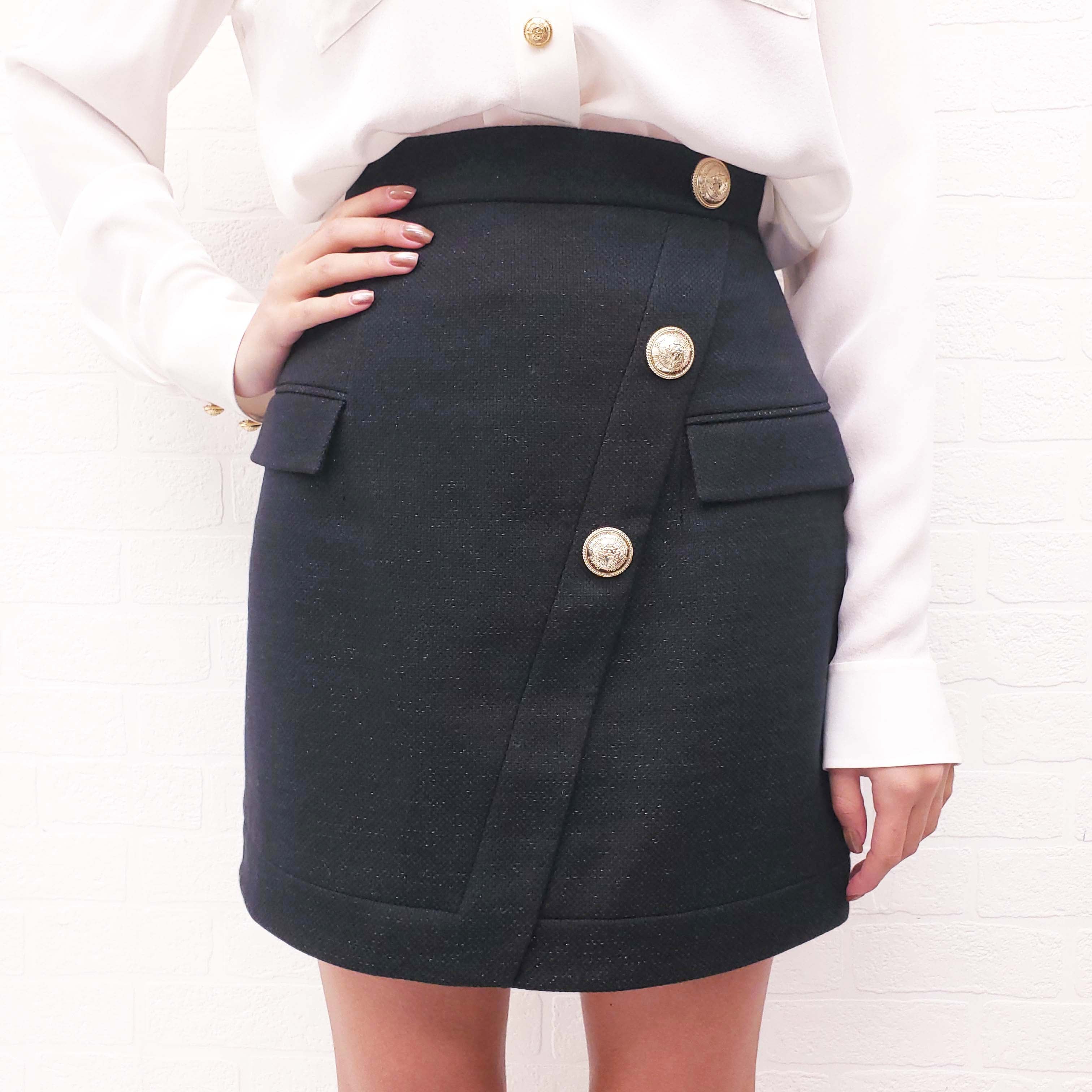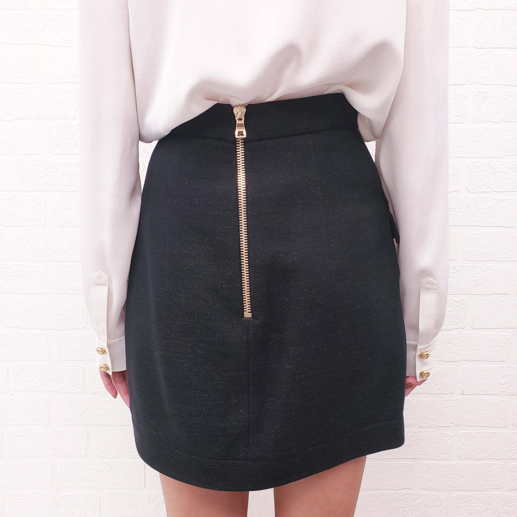 BALMAIN BLACK SPARKLE SKIRT WITH GOLD LOGO BUTTONS - SIZE 38