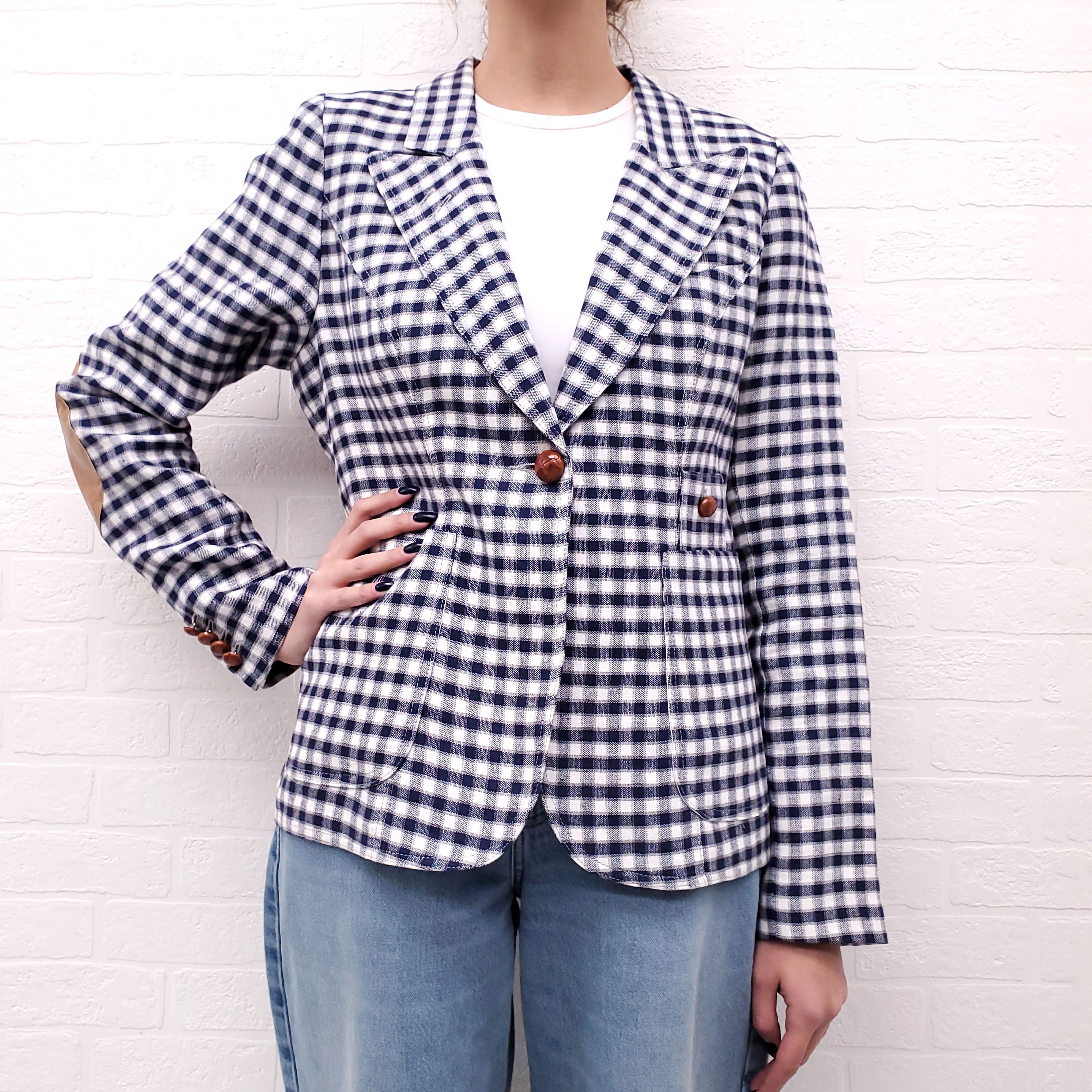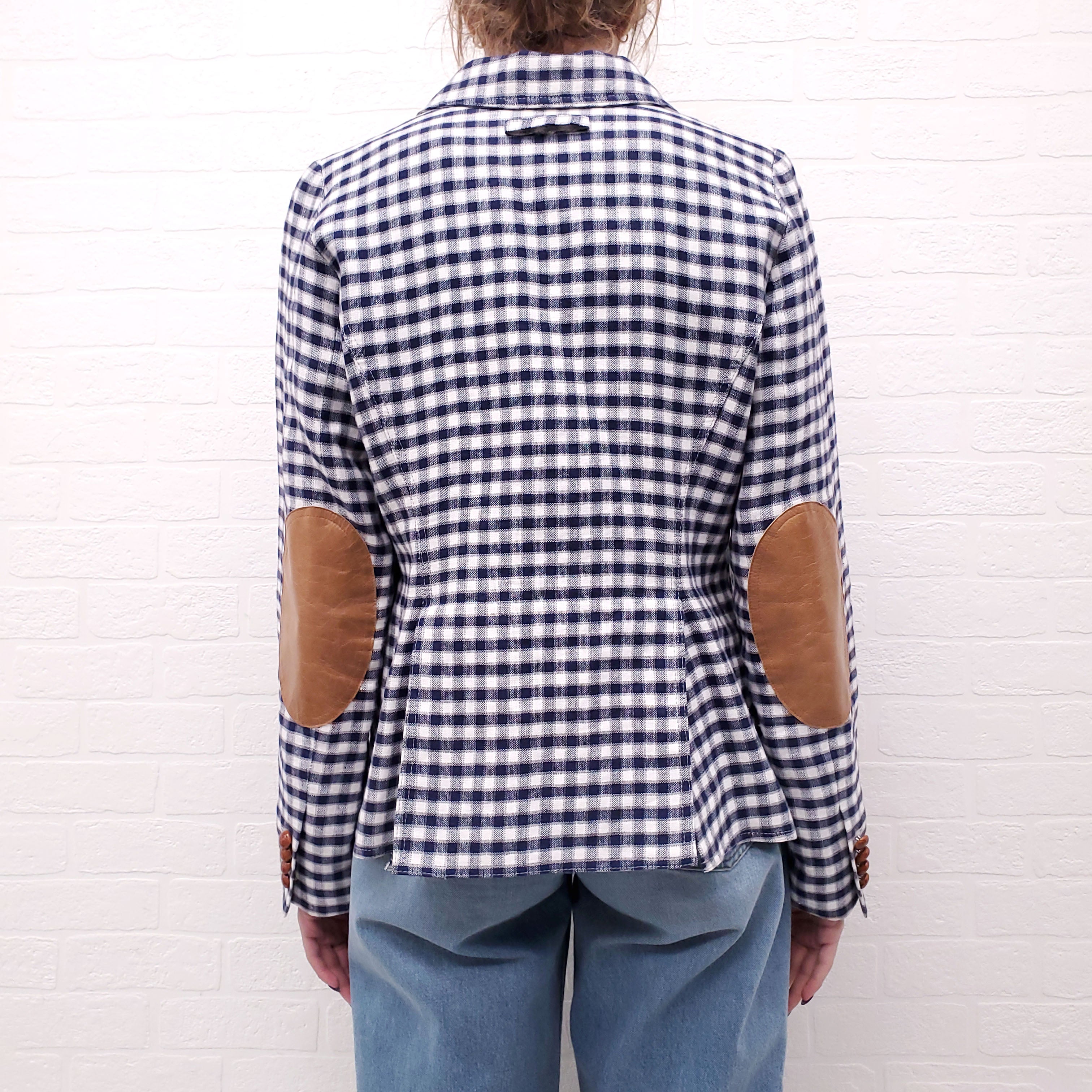 SMYTHE BLUE AND WHITE PLAID BLAZER WITH LEATHER ELBOW DETAIL - SIZE 12