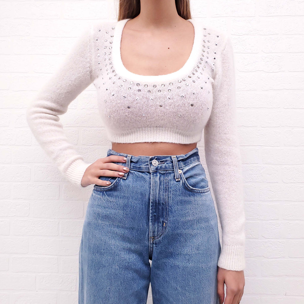ALESSANDRA RICH CREAM CRYSTAL LONG SLEEVE SWEATER - SIZE 38
