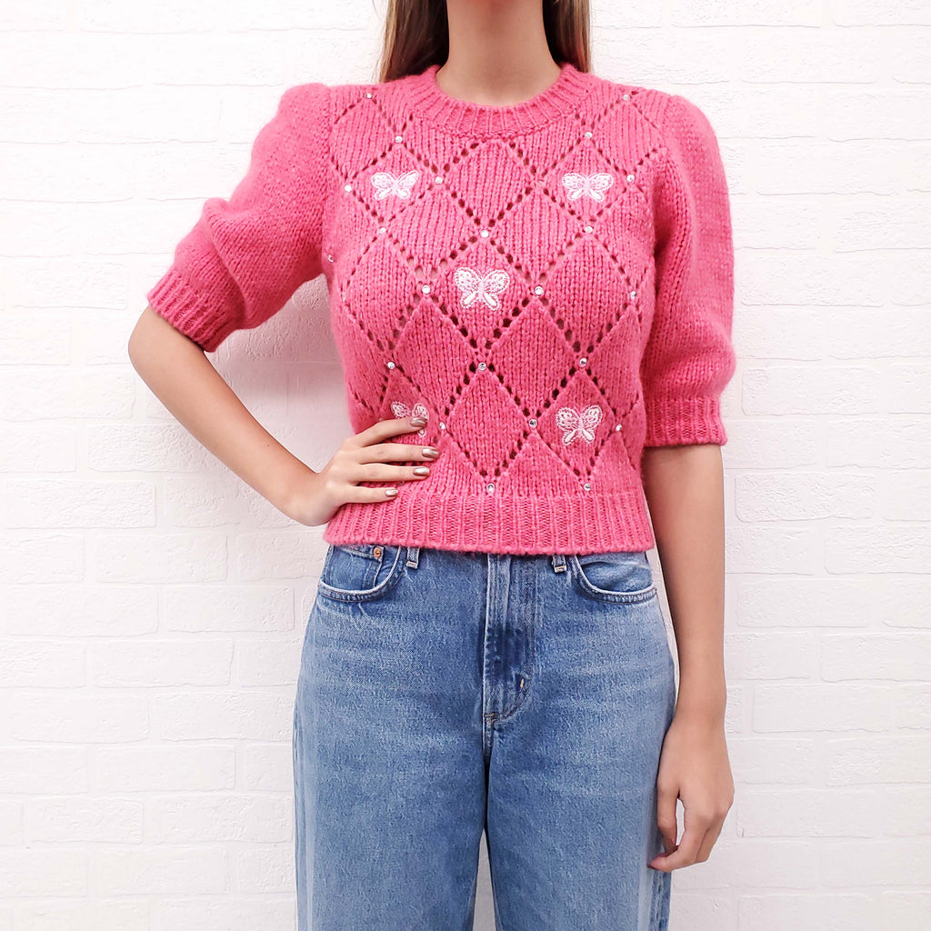 ALESSANDRA RICH PINK CRYSTAL AND BUTTERFLY SHORT SLEEVE SWEATER - SIZE 40