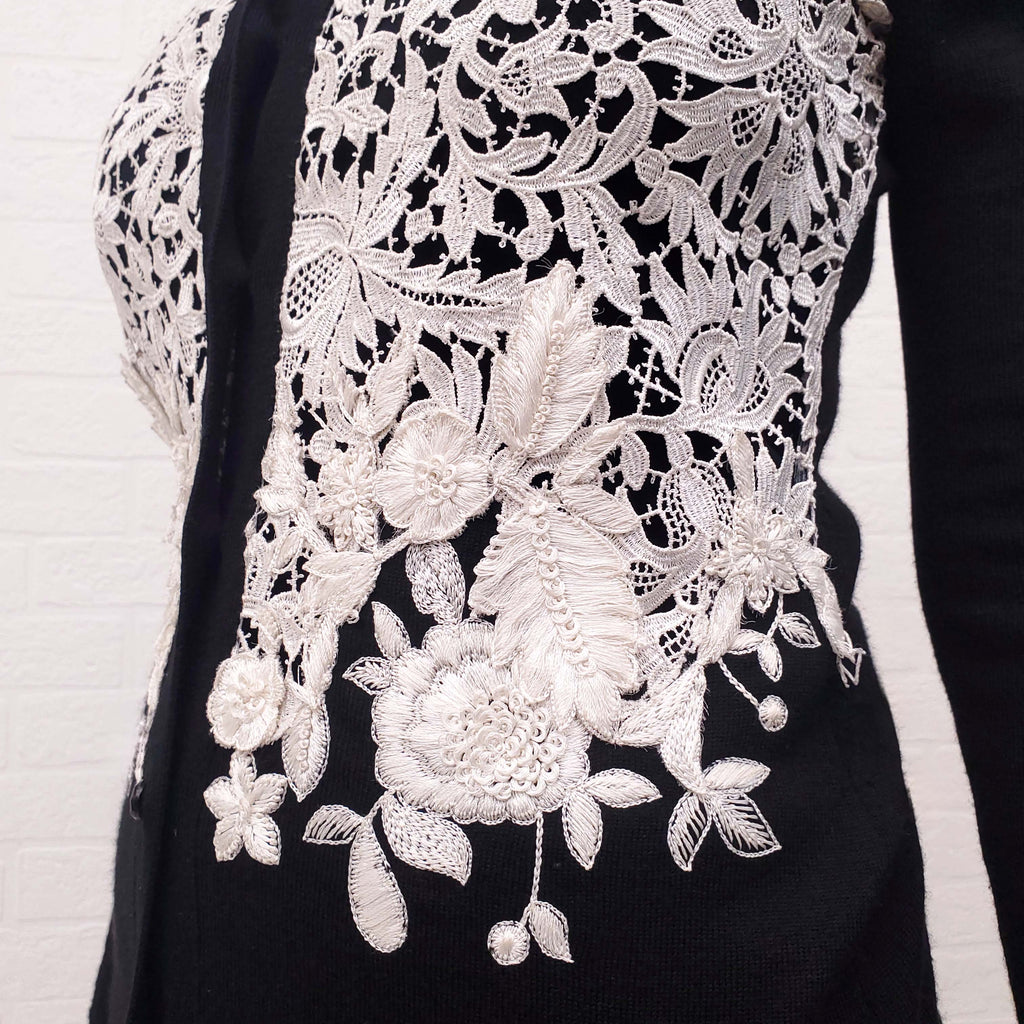 OSCAR DE LA RENTA BLACK CARDIGAN WITH CREAM EYELET DETAIL - SIZE S