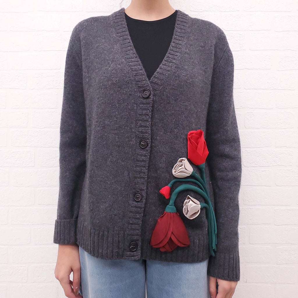 PRADA GREY CARDIGAN WITH SILK FLOWER DETAIL - SIZE 42