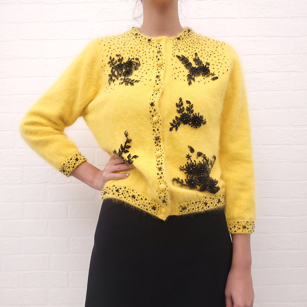 PRADA YELLOW MOHAIR CARDIGAN WITH BLACK BEADING - SIZE 44