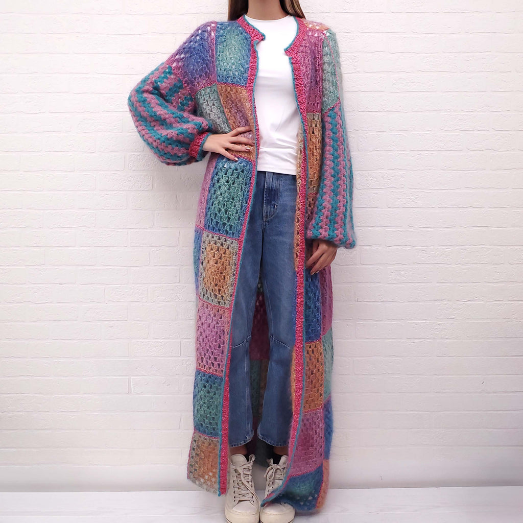 ROSE CARMINE METALLIC PINK AND MULTI-COLOUR SQUARE PATTERN LONG CROCHET CARDIGAN - O/S