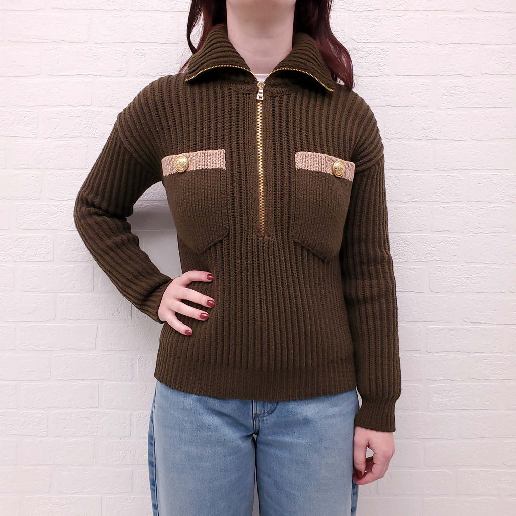 BALMAIN OLIVE SWEATER WITH FRONT POCKETS - SIZE 34