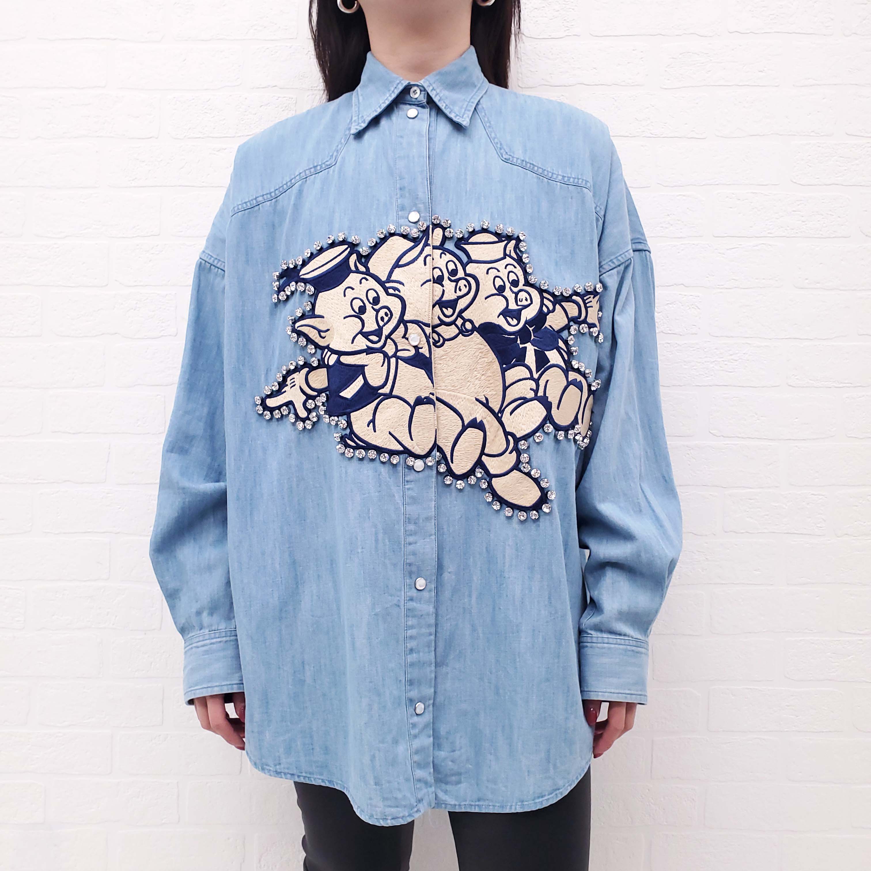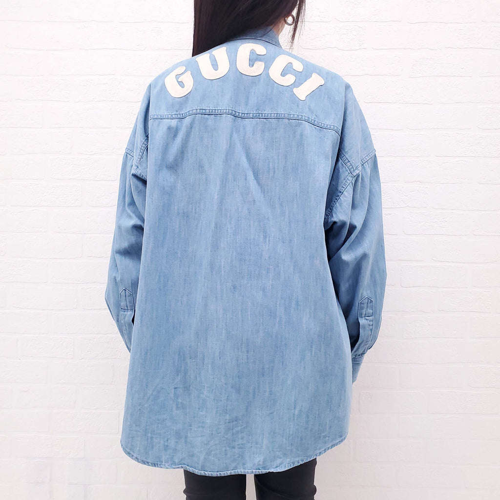 GUCCI 2019 OVERSIZED CRYSTAL LOGO 'YEAR OF THE PIG' DENIM SHIRT - SIZE 40
