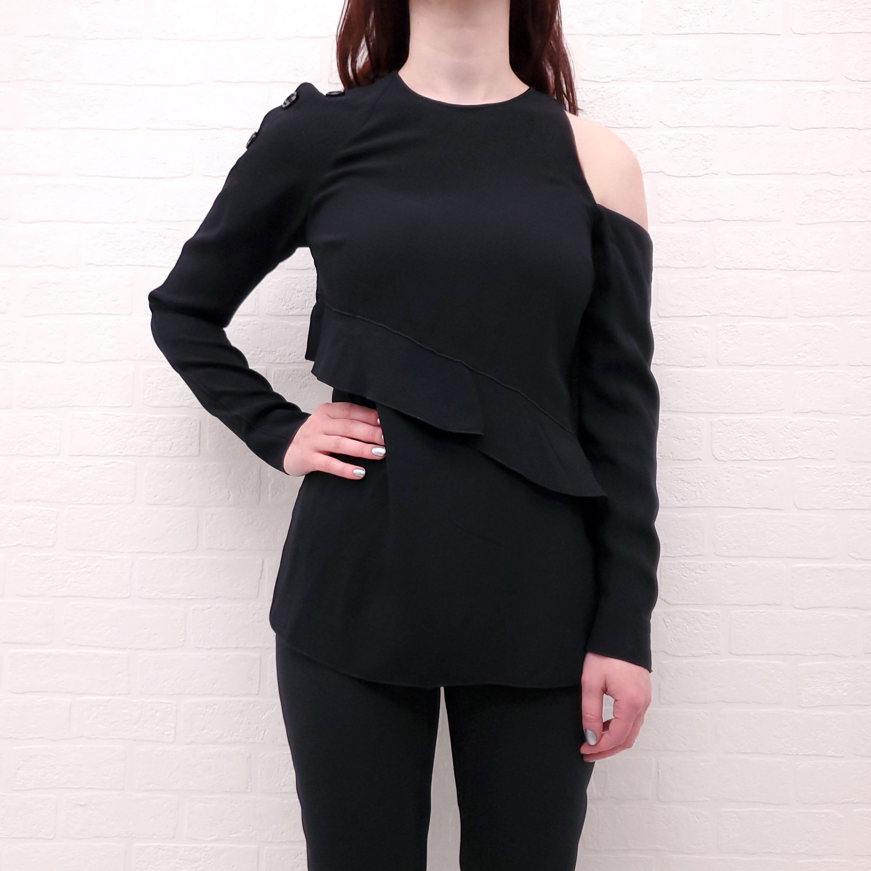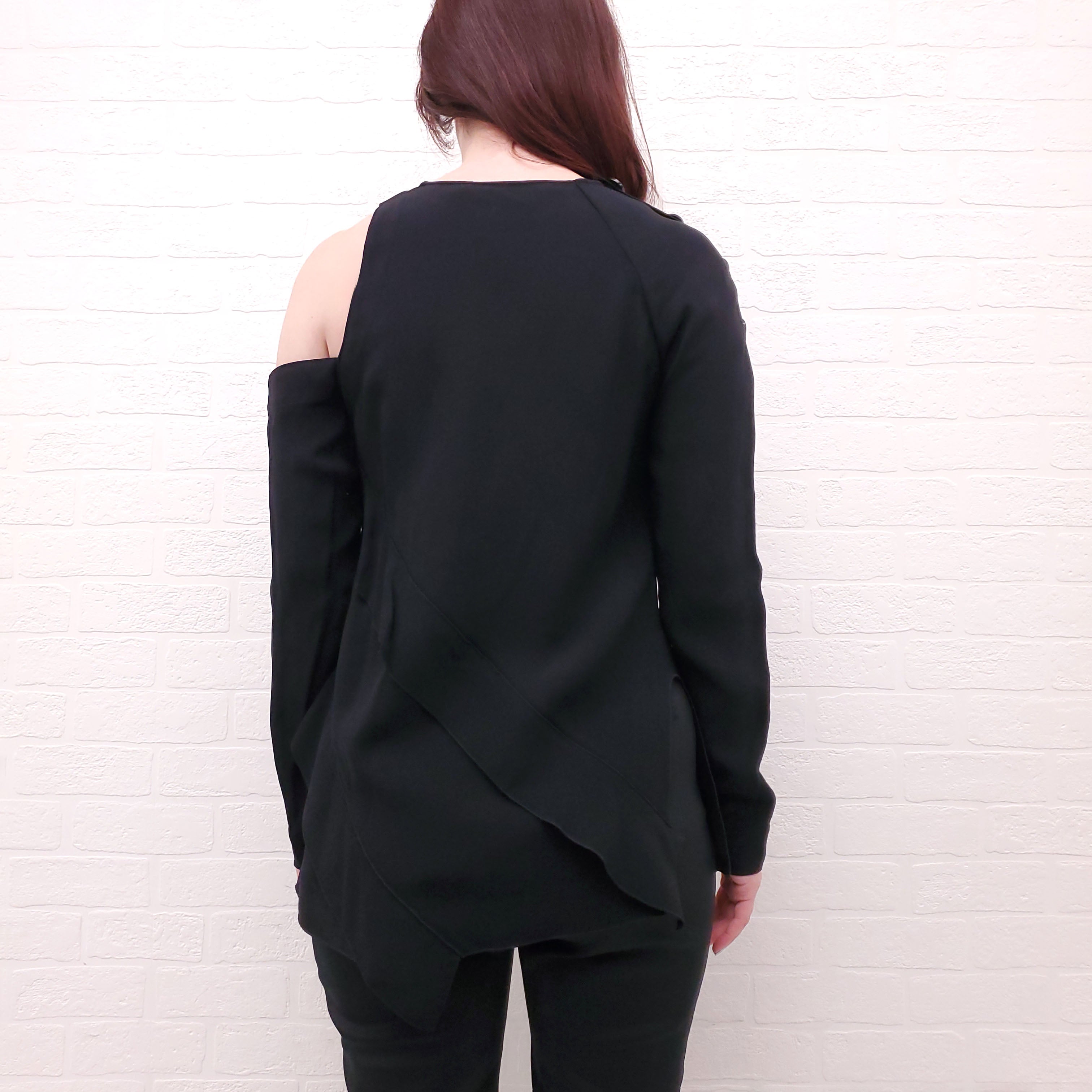 PROENZA SCHOULER BLACK SATIN CREPE BLOUSE WITH ONE SHOULDER CUTOUT DETAIL - SIZE 2
