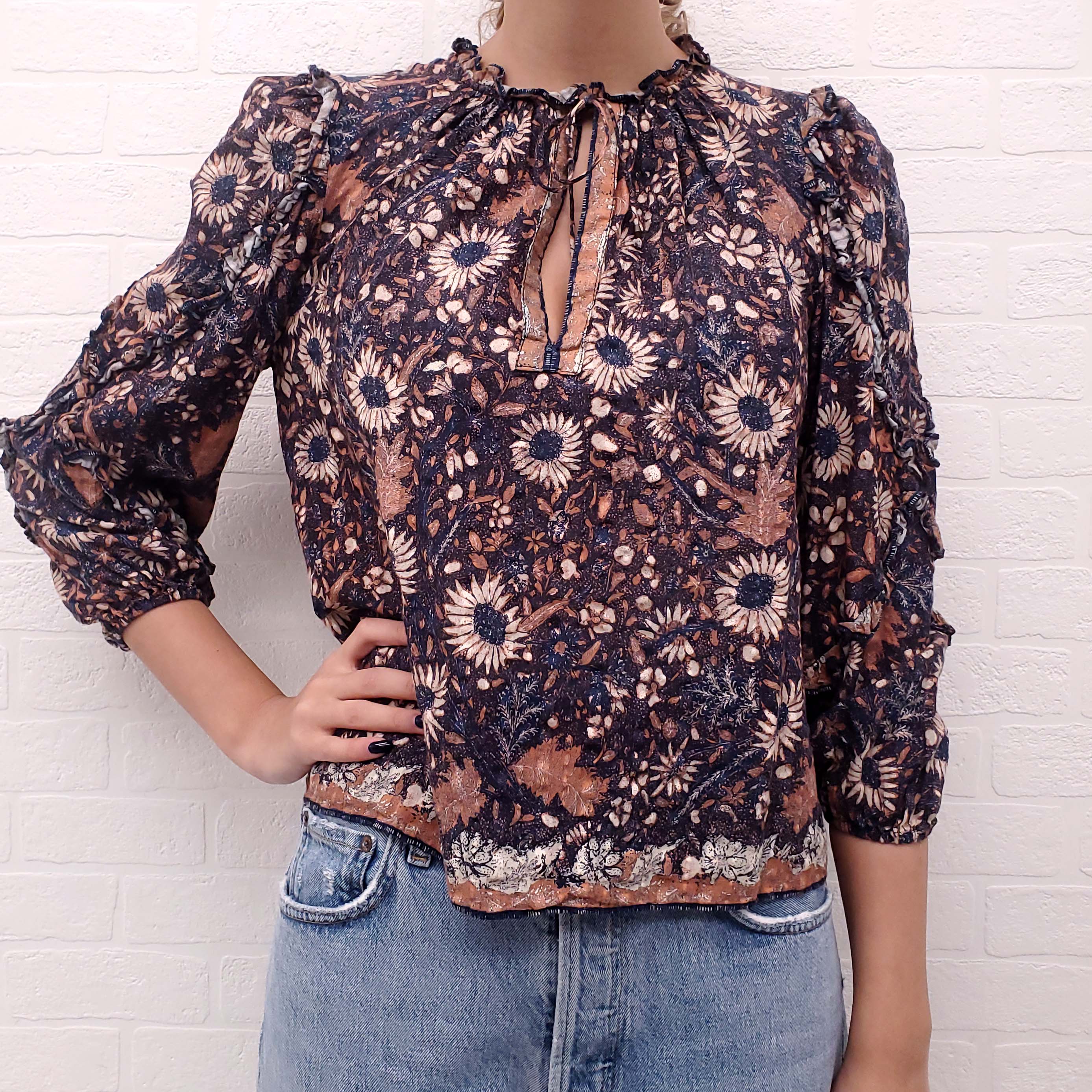 ULLA JOHNSHON BLUE & CARAMEL FLORAL PATTERNED BLOUSE - SIZE 4
