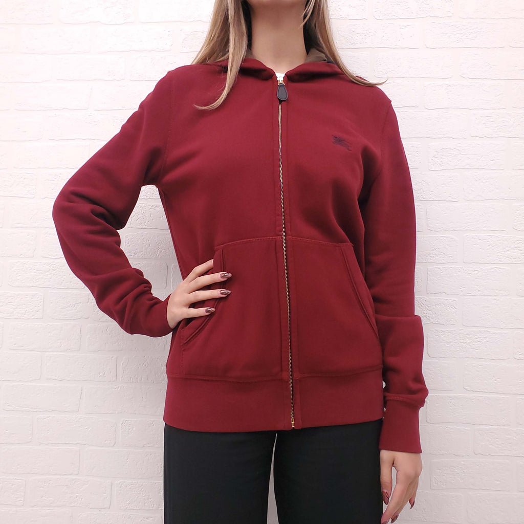 BURBERRY BRIT UNISEX RED ZIP UP SWEATSHIRT WITH CHECK HOOD - SIZE M