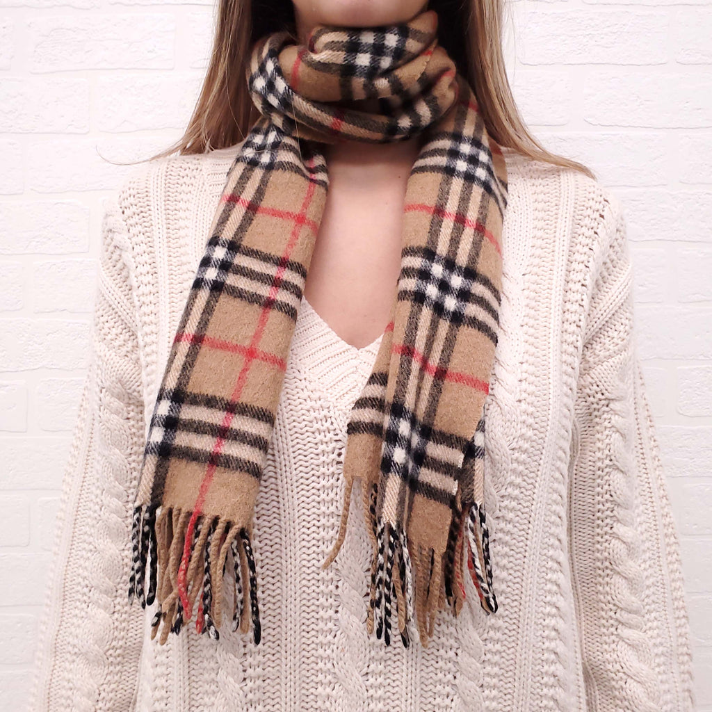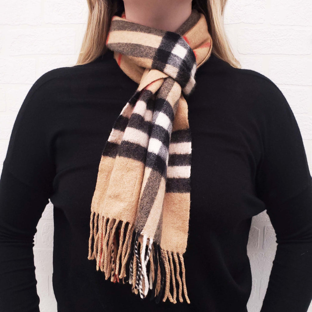 BURBERRY CAMEL CASHMERE CHECK SCARF WITH FRINGE