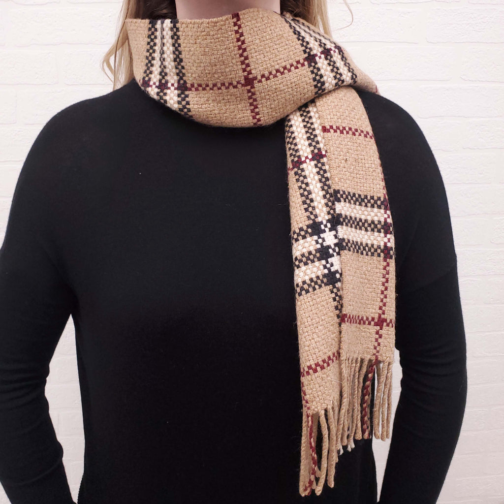 BURBERRY CAMEL CASHMERE CHECK KNIT SCARF WITH FRINGE