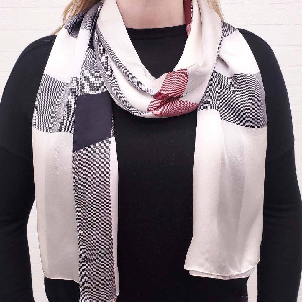 BURBERRY BLUE, BURGUNDY AND PURPLE SILK CHECK SCARF