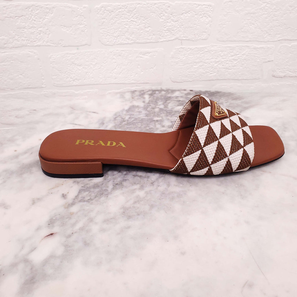 PRADA CREAM AND TAN LOGO SLIDES - SIZE 40