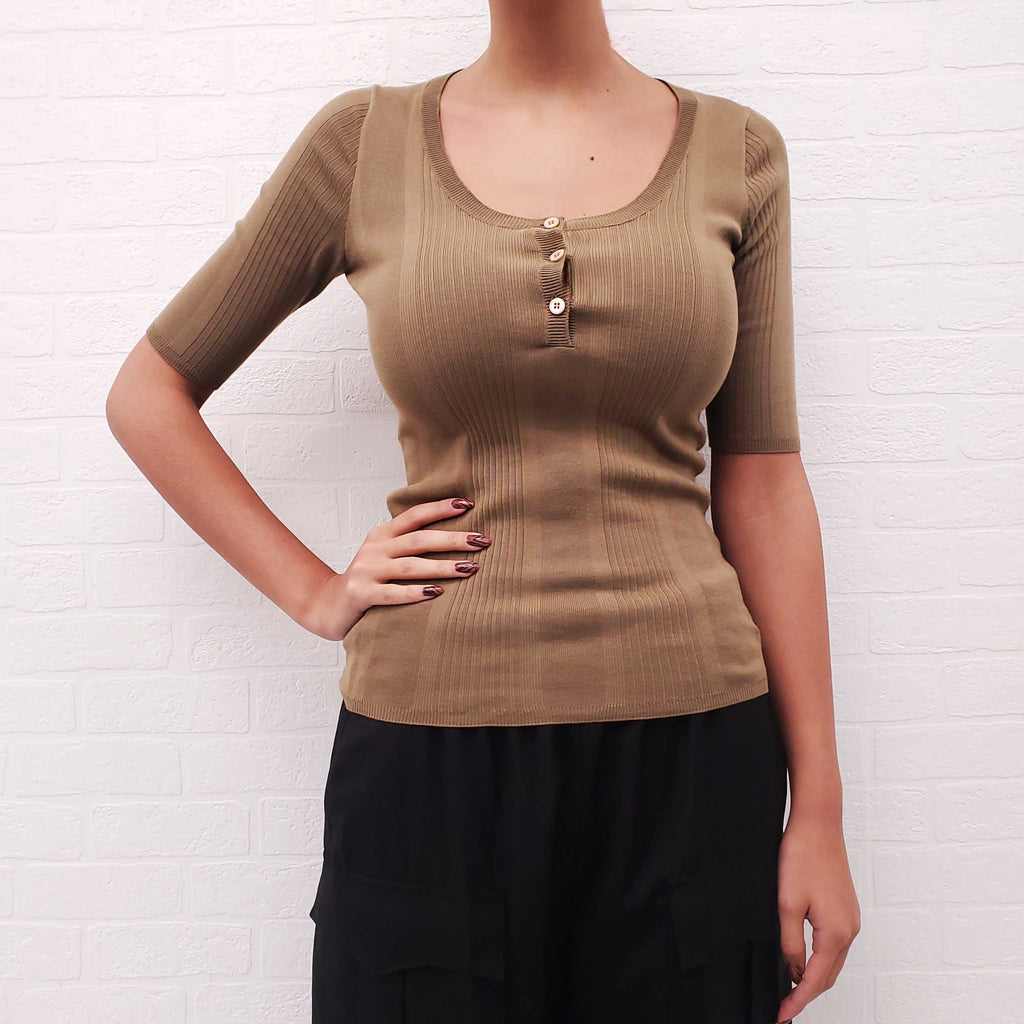 PRADA KHAKI SHORT SLEEVE KNIT TOP WITH LOGO DETAIL - SIZE 40