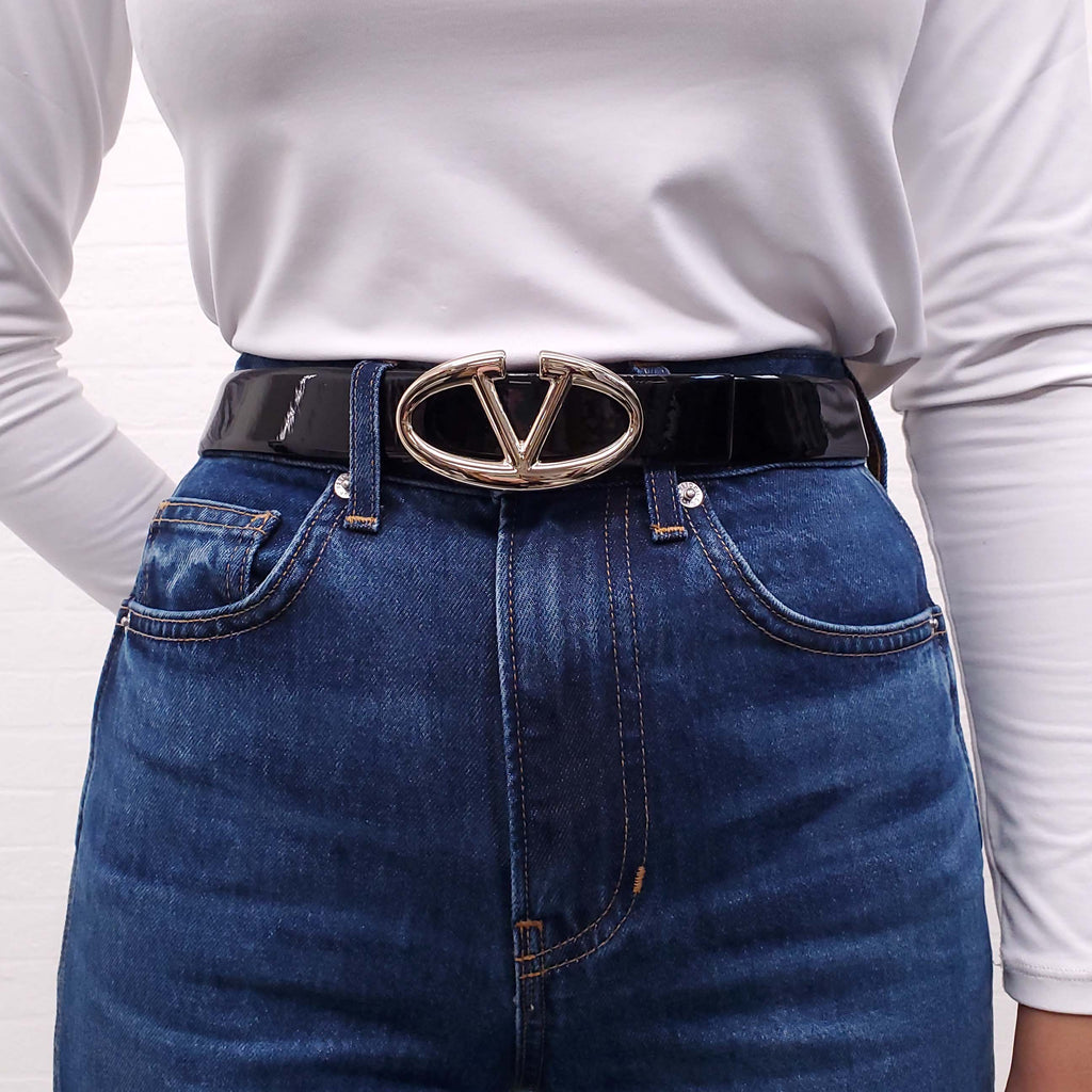 VALENTINO BLACK PATENT LOGO BELT - SIZE 80