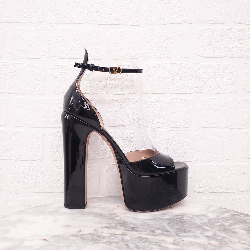 VALENTINO BLACK PATENT PEEP TOE 'TAN-GO' PLATFORM HEELS WITH LOGO STRAP - SIZE 40