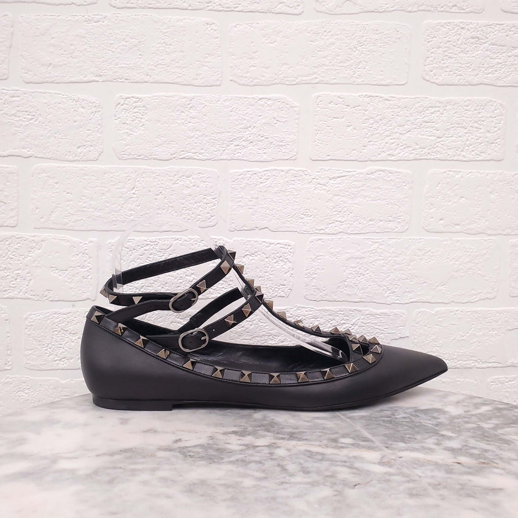VALENTINO BLACK ROCKSTUD ANKLE STRAP FLATS - SIZE 41