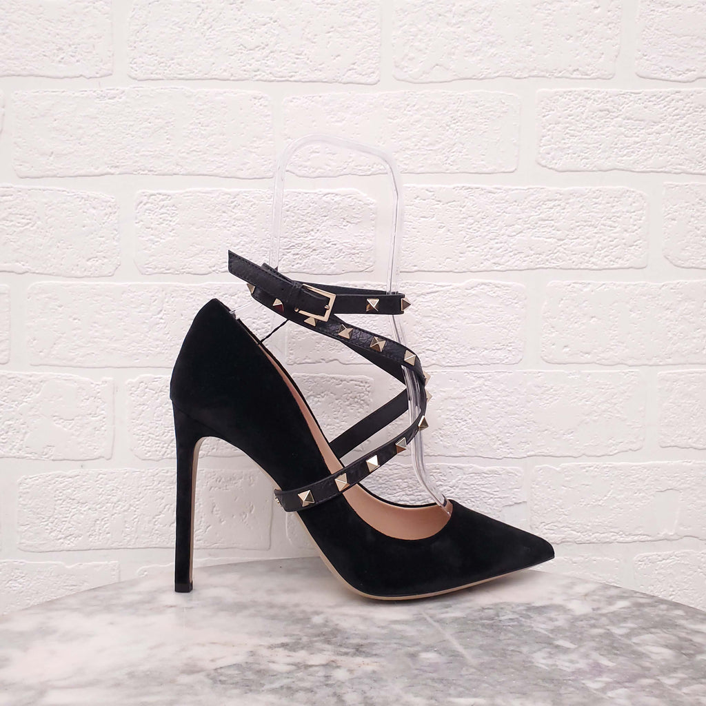 VALENTINO BLACK VELVET ROCKSTUD ANKLE STRAP HEELS - SIZE 40