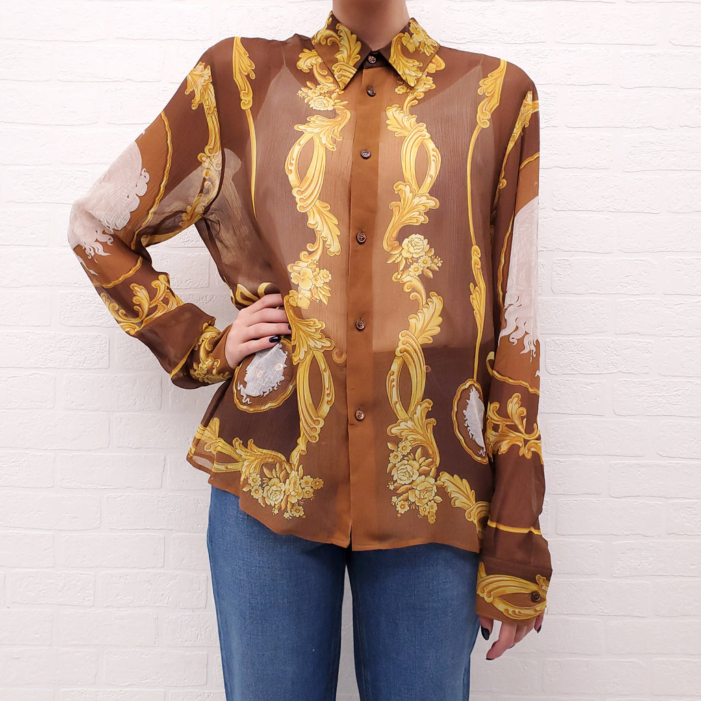 VERSACE BROWN SILK CAMEO CREPE BUTTON UP BLOUSE - SIZE 48