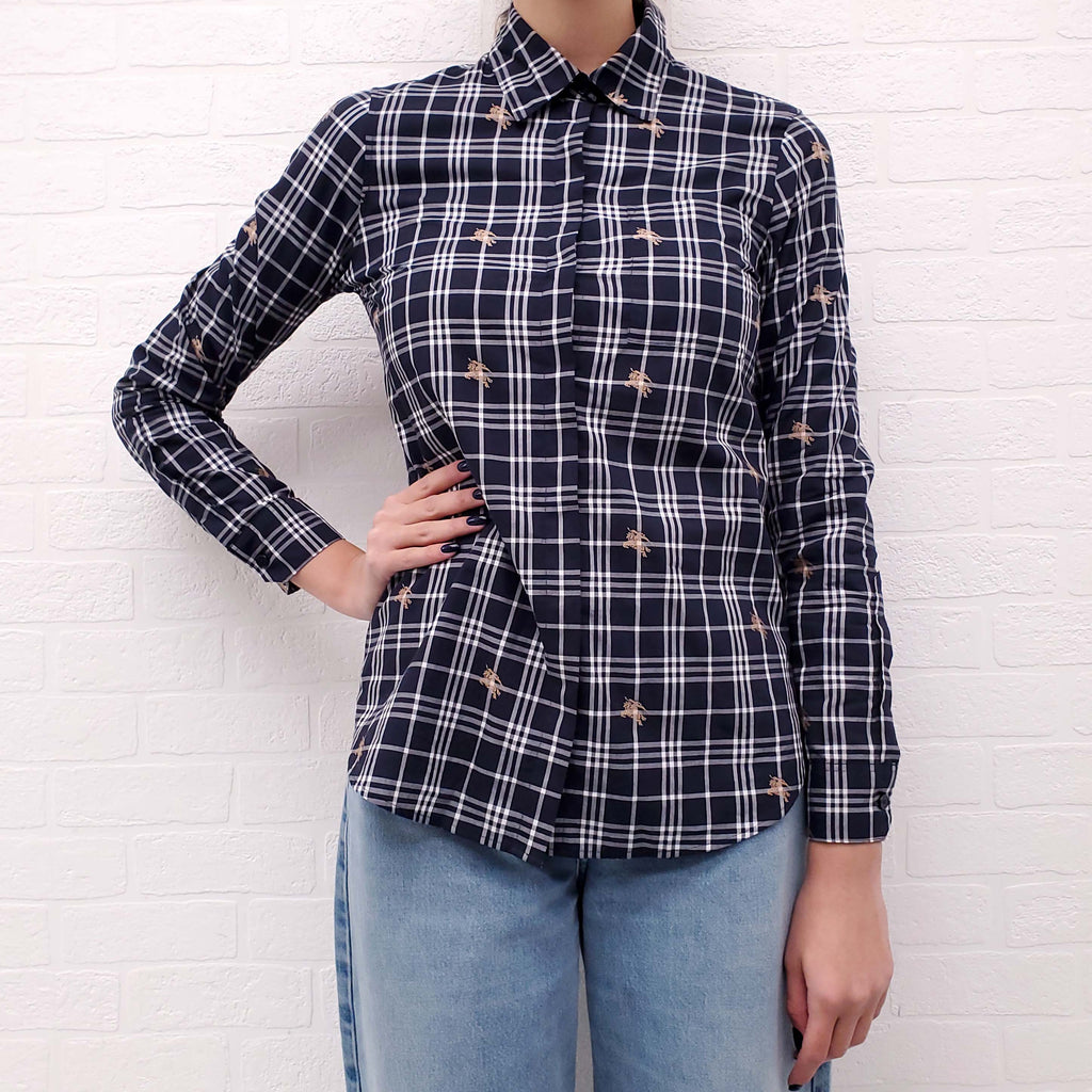 BURBERRY NAVY PLAID BLOUSE WITH BRIT LOGO - SIZE 2