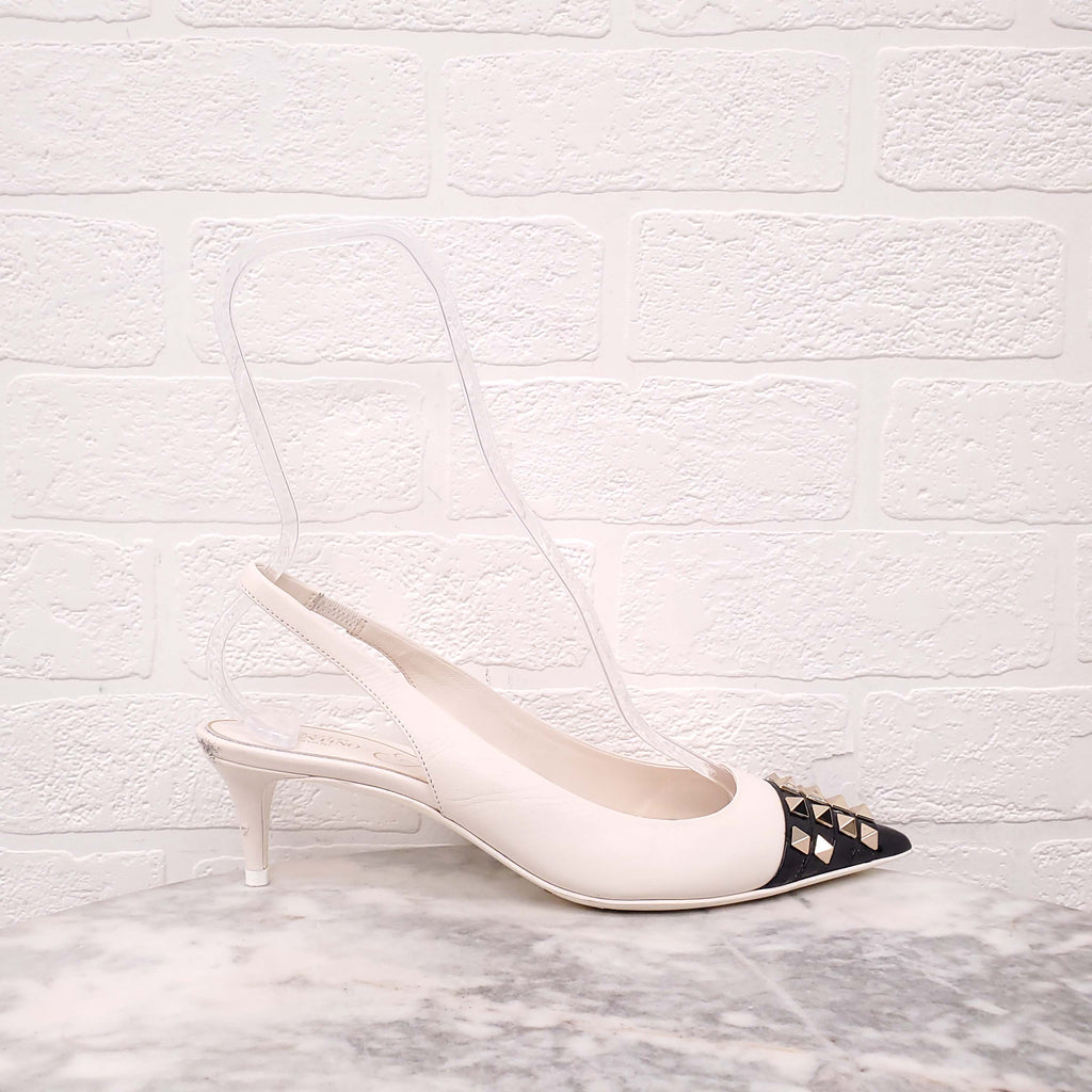 VALENTINO CREAM AND BLACK PATENT ROCKSTUD SLINGBACK KITTEN HEELS - SIZE 37.5