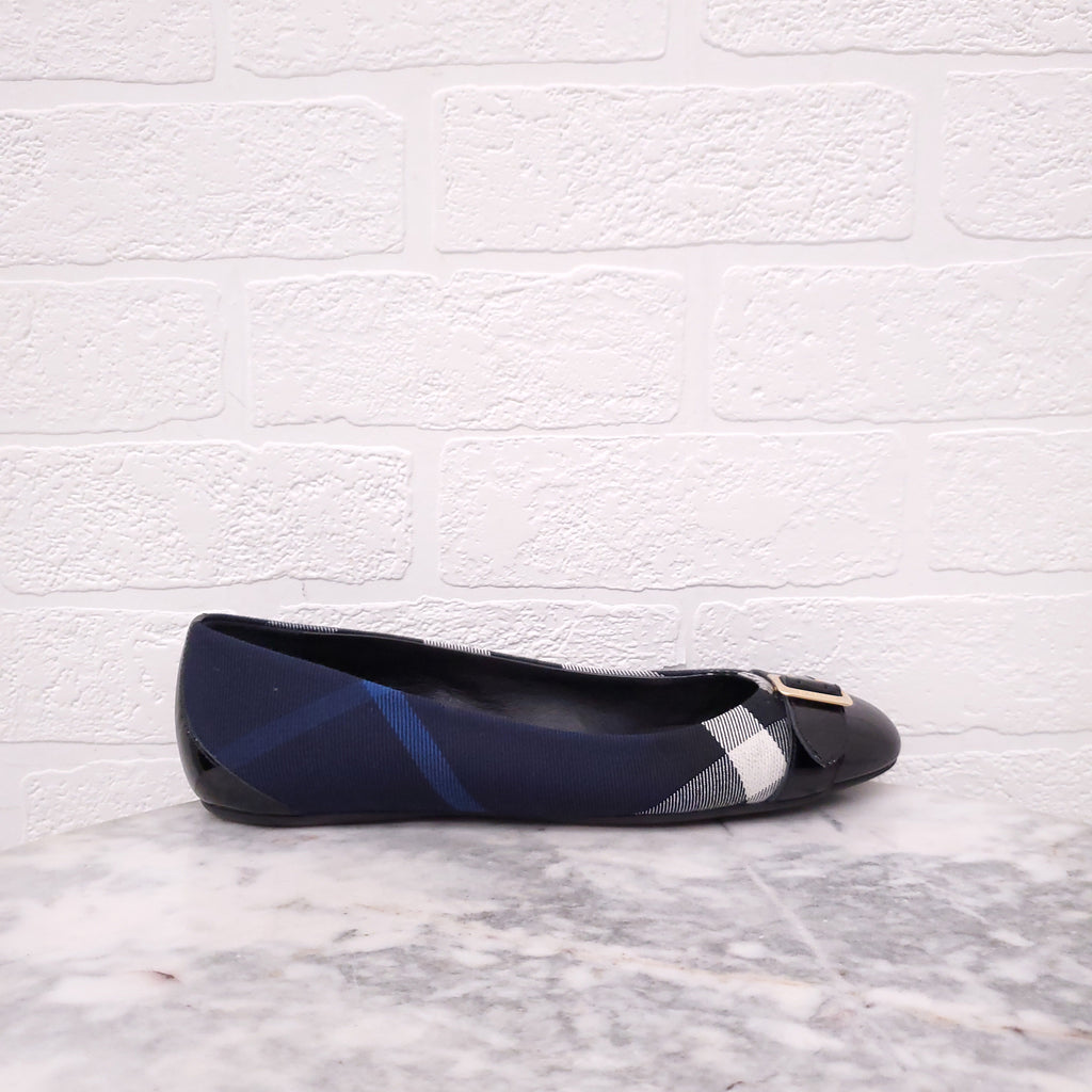 BURBERRY NAVY CHECK BALLET FLATS WITH PATENT CAP TOE AND BUCKLE DETAIL - SIZE 37.5