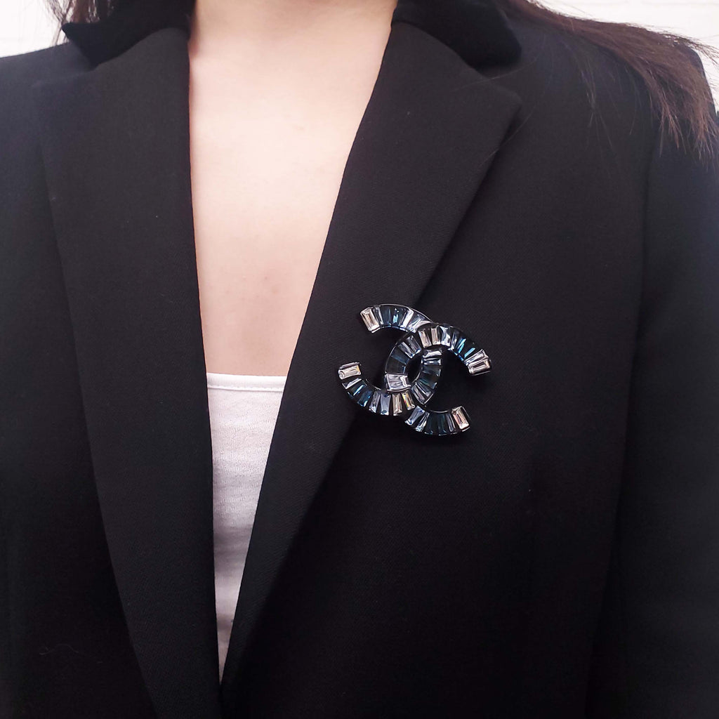 CHANEL BLUE CRYSTAL LOGO BROOCH