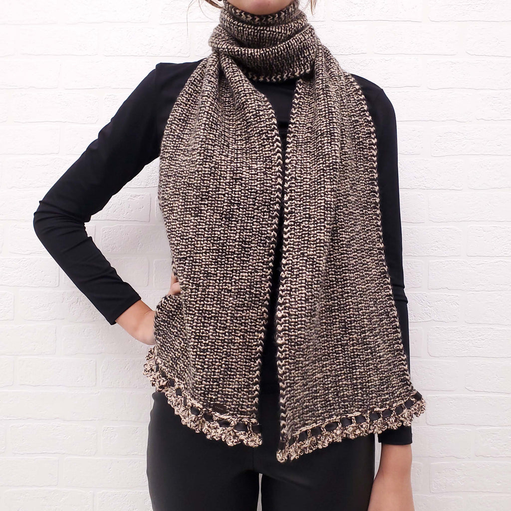 CHANEL BROWN KNIT WINTER SCARF WITH LEATHER WOVEN DETAIL AND LOGO