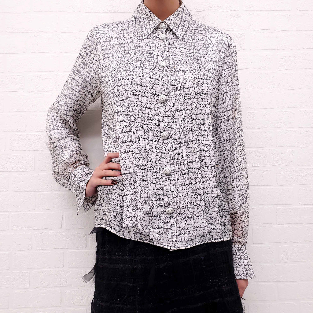 CHANEL CREAM AND BLACK SILK CURSIVE LOGO BLOUSE - SIZE 42