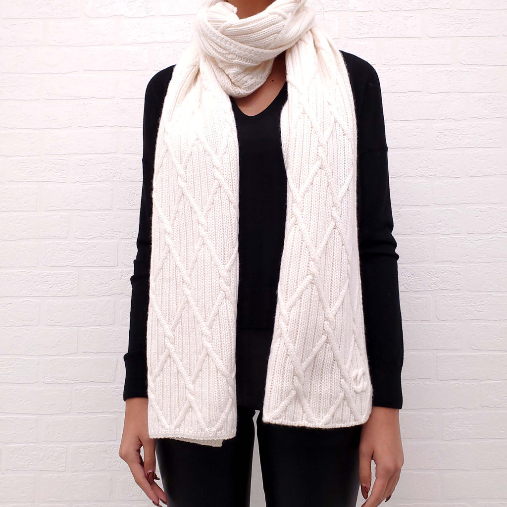 CHANEL CREAM CASHMERE CABLE KNIT WINTER SCARF WITH LOGO