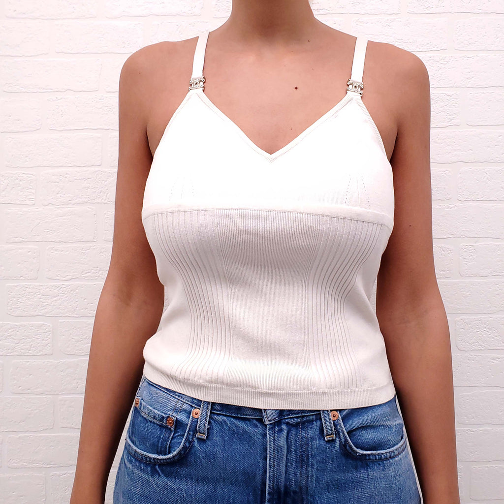 CHANEL CREAM KNIT TANK TOP WITH CRYSTAL LOGO STRAP - SIZE 36