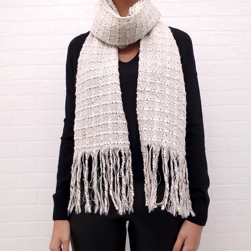 CHANEL CREAM TWEED WINTER SCARF WITH LION LOGO