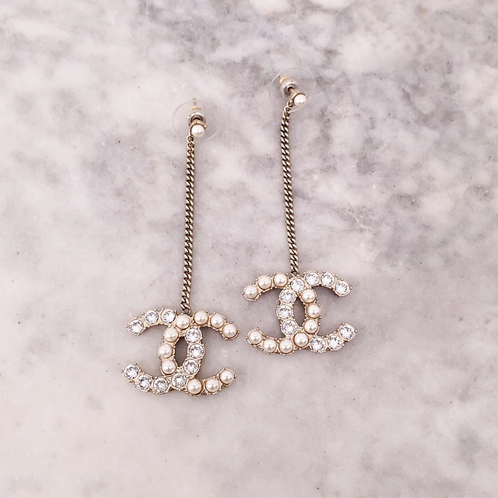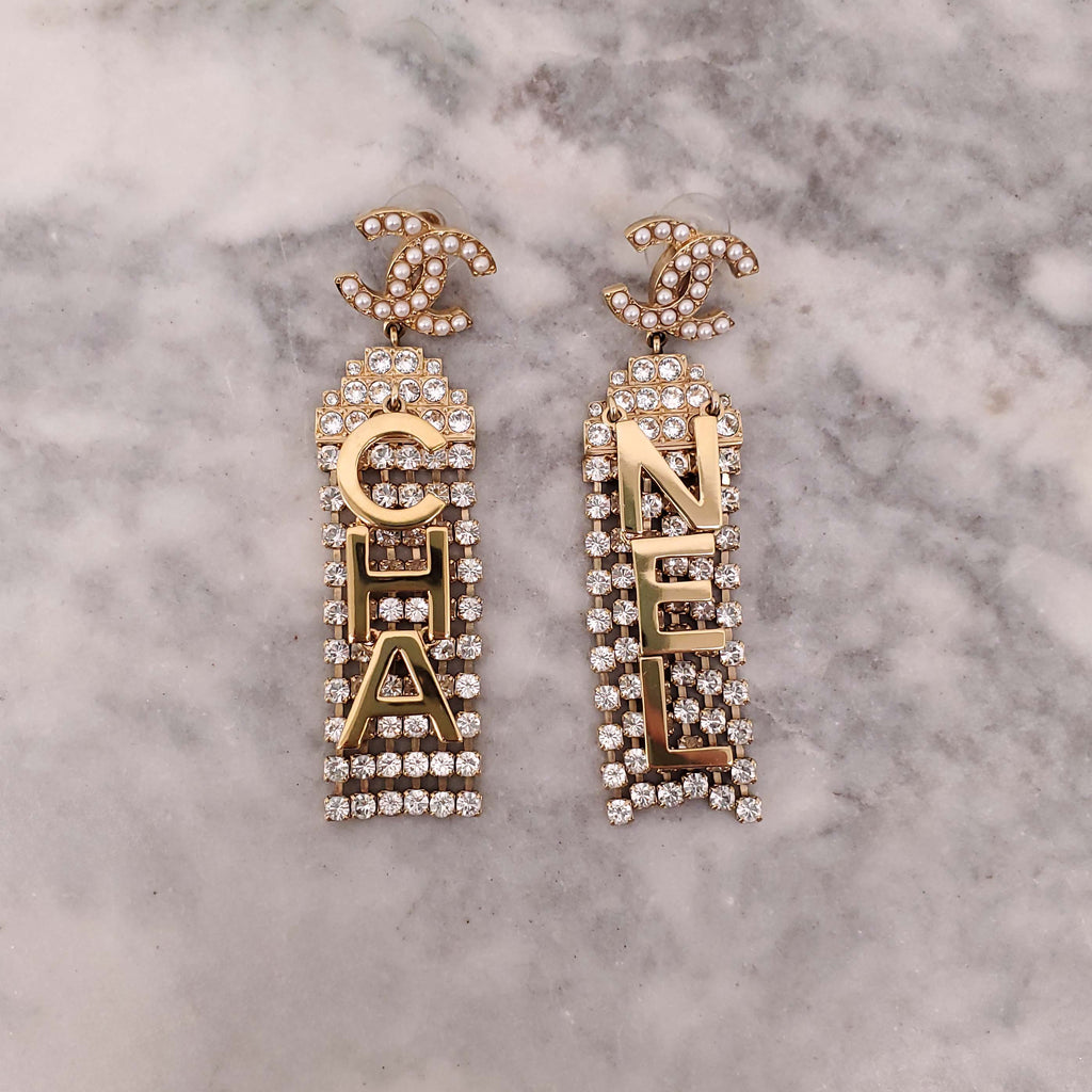 CHANEL CRYSTAL AND PEARL LOGO DROP EARRINGS