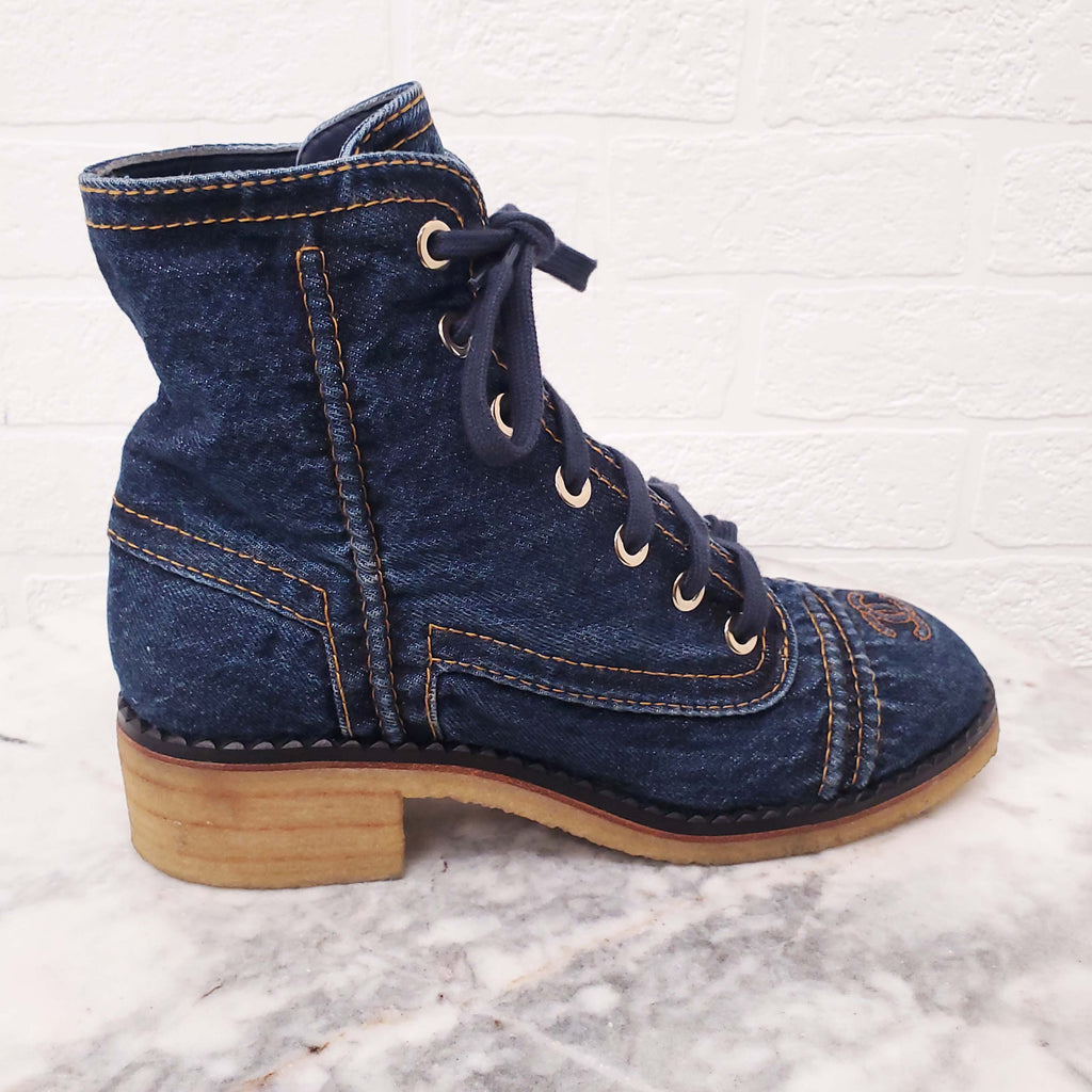 CHANEL DENIM LOGO MOTORCYCLE BOOTS - SIZE 39