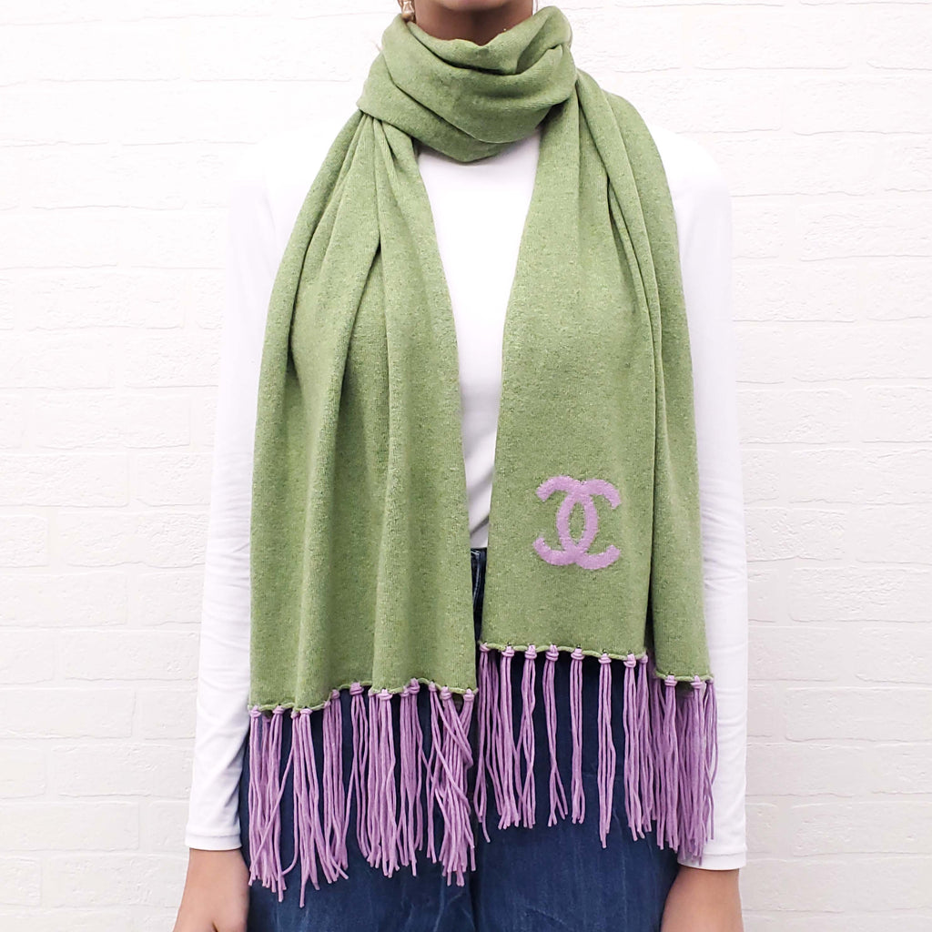 CHANEL GREEN AND PURPLE CASHMERE LOGO SCARF
