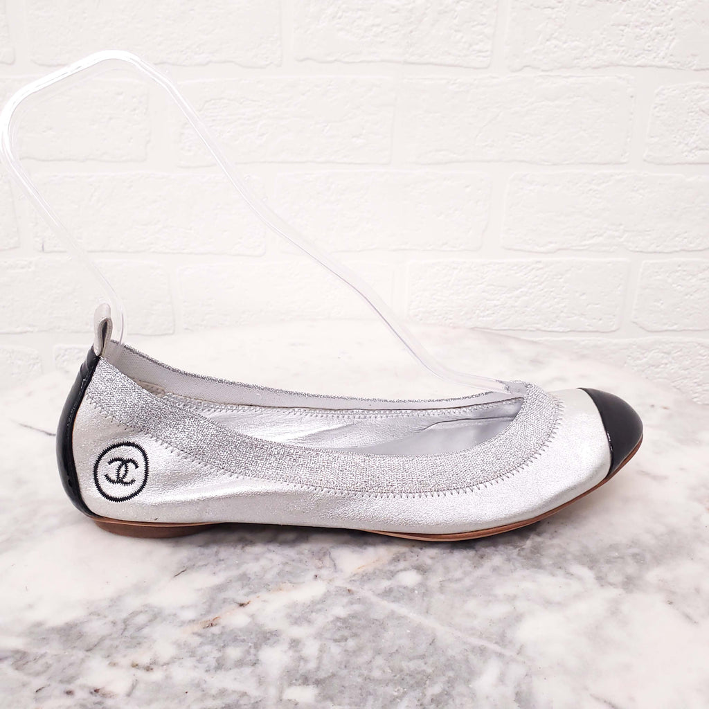 CHANEL METALLIC SILVER LOGO ELASTIC FLATS - SIZE 40