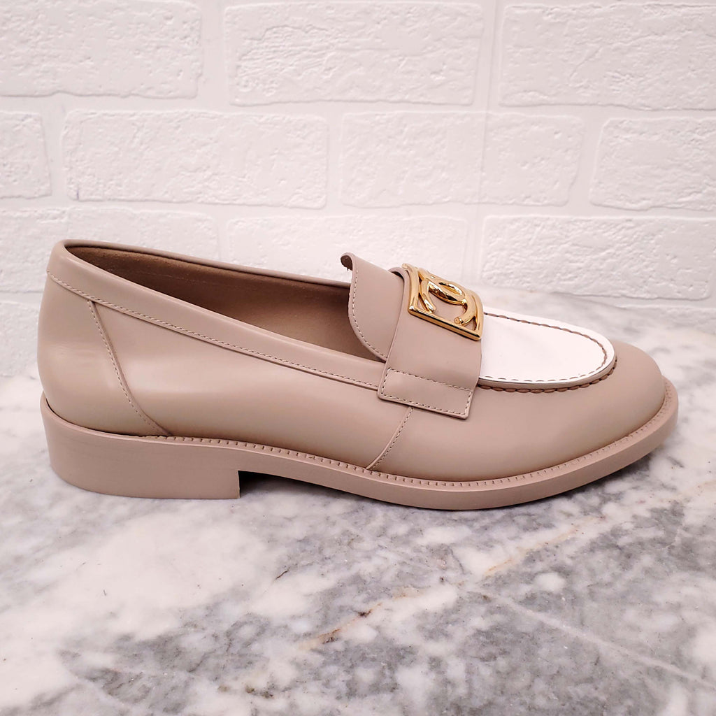 CHANEL NUDE AND WHITE LOGO LOAFERS - SIZE 39.5C