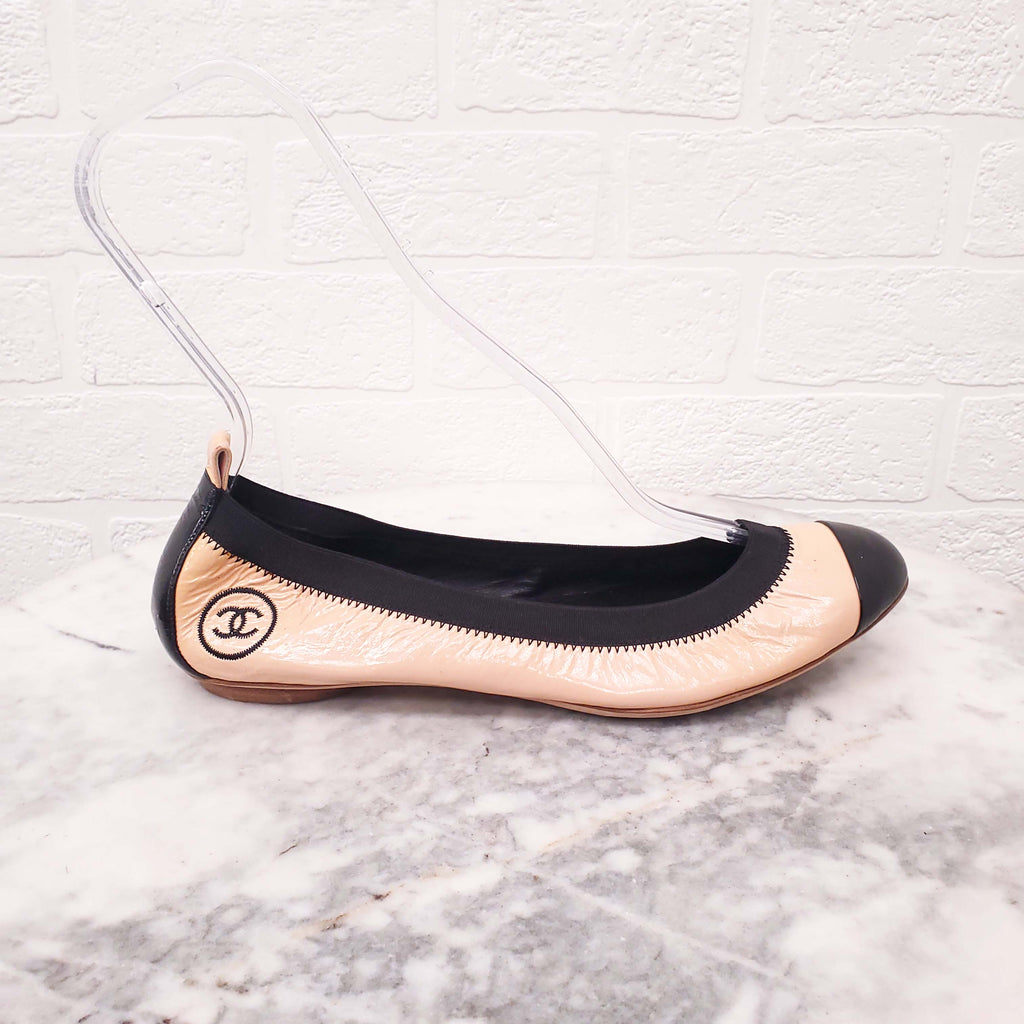 CHANEL PEACH PATENT LOGO ELASTIC FLATS - SIZE 40