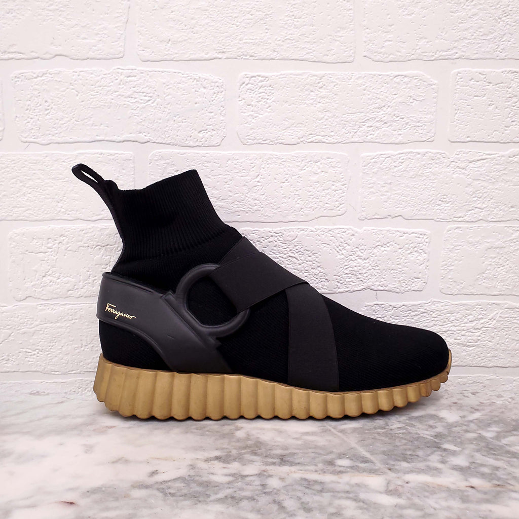 SALVATORE FERRAGAMO BLACK AND GOLD SOCK SNEAKERS - SIZE 8