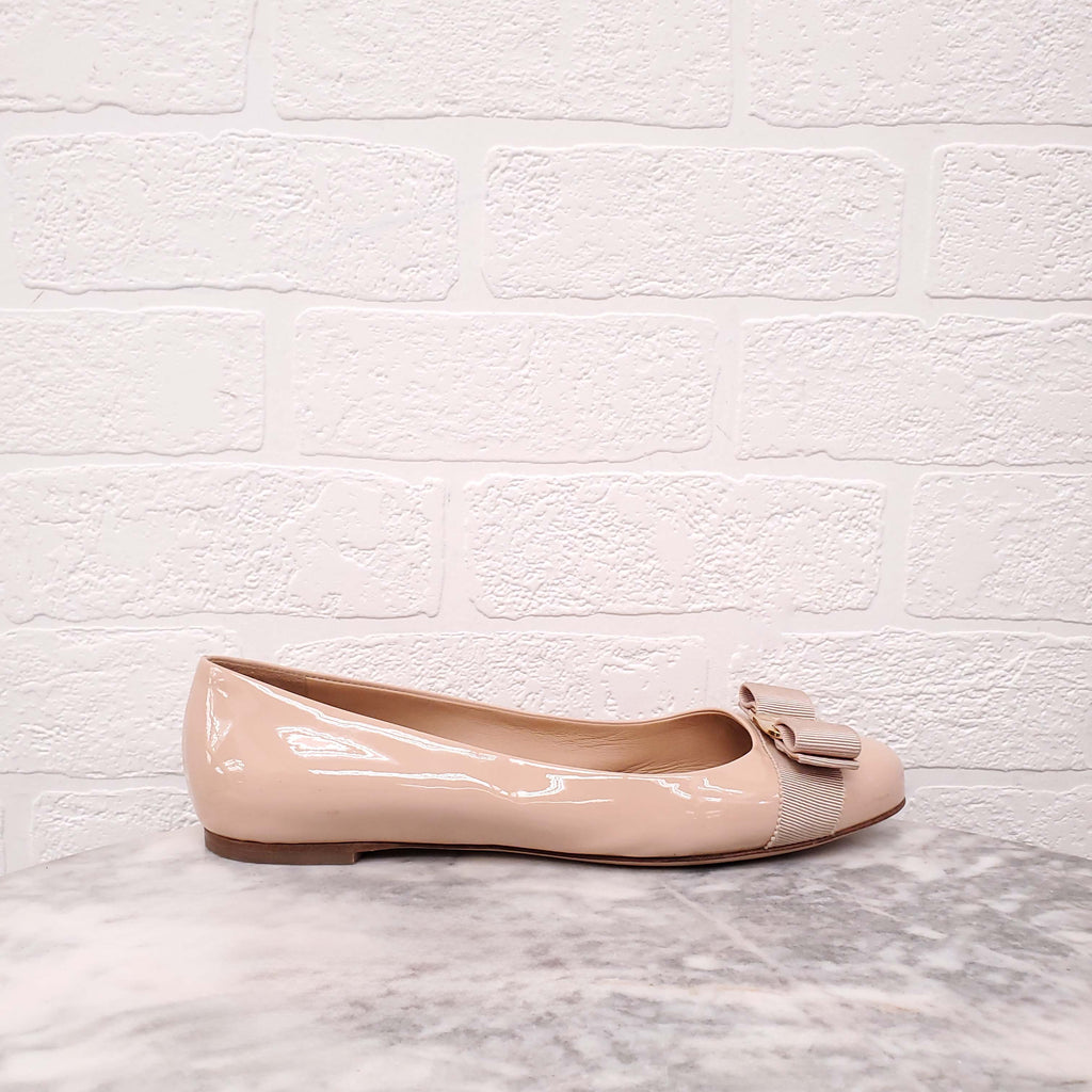 SALVATORE FERRAGAMO NUDE PATENT BALLET FLATS WITH BOW - SIZE 7.5