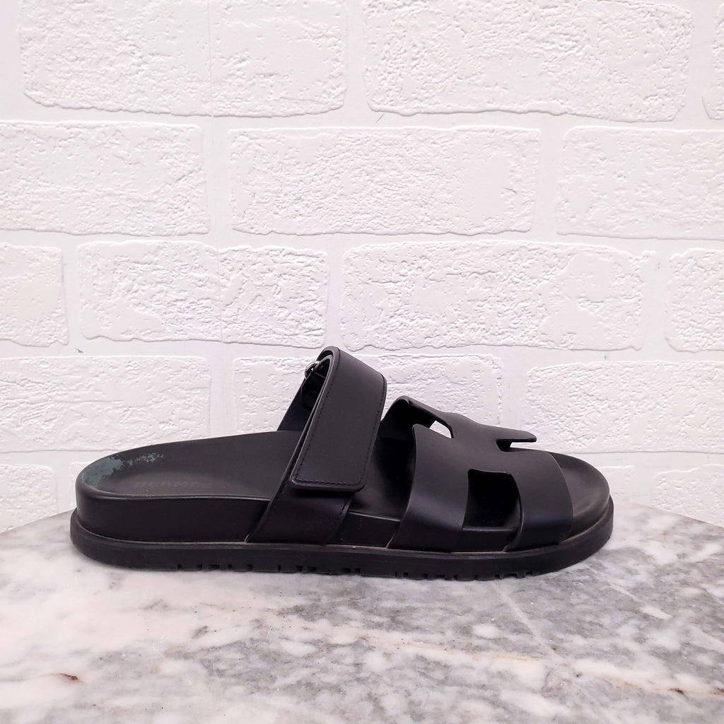 HERMÈS BLACK LEATHER CHYPRE SANDALS - SIZE 38
