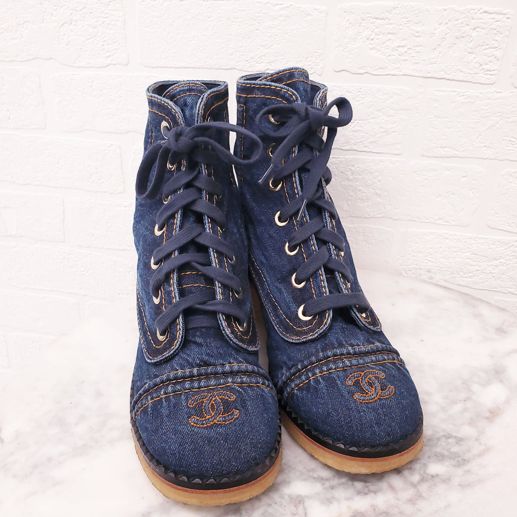 CHANEL DENIM LOGO MOTORCYCLE BOOTS - SIZE 39
