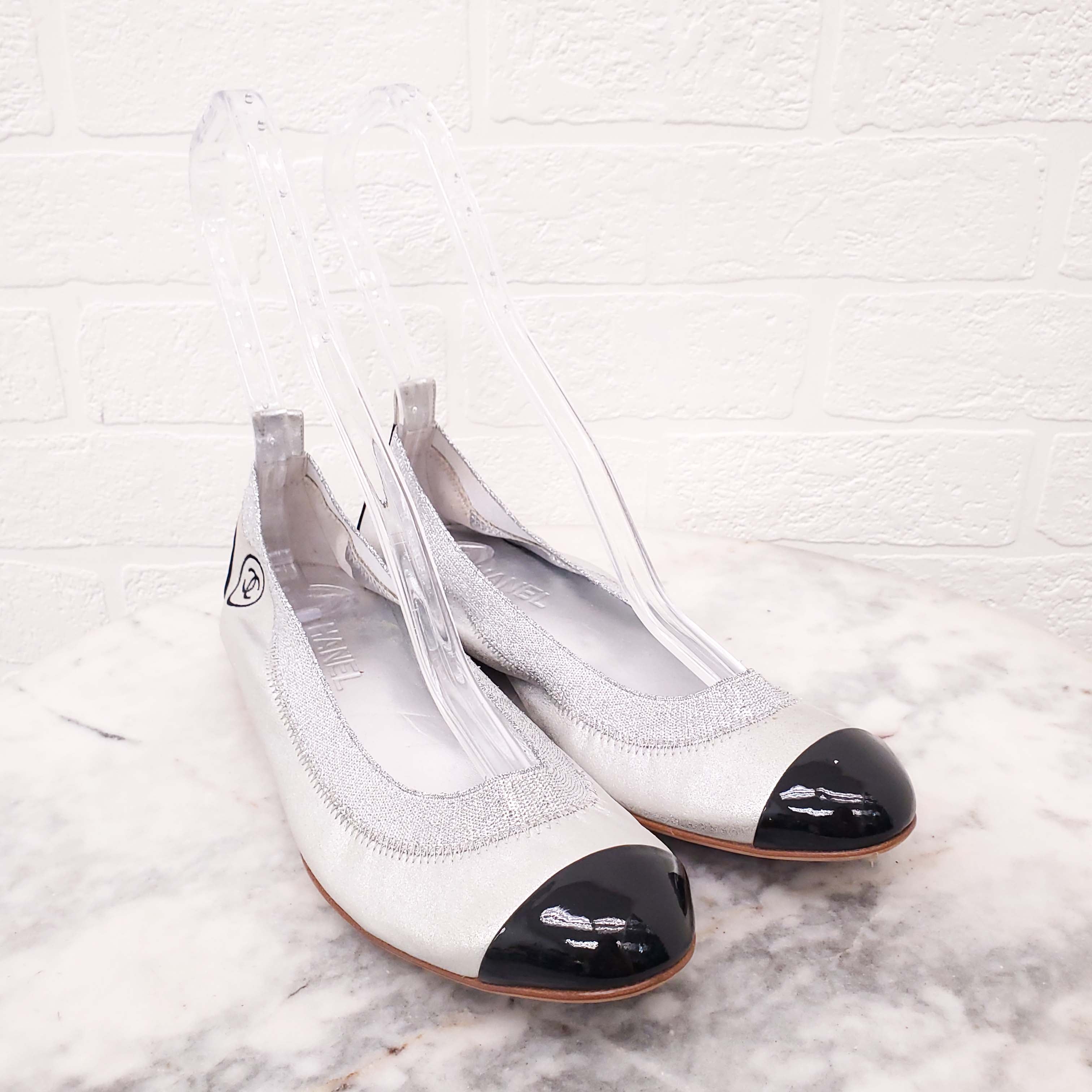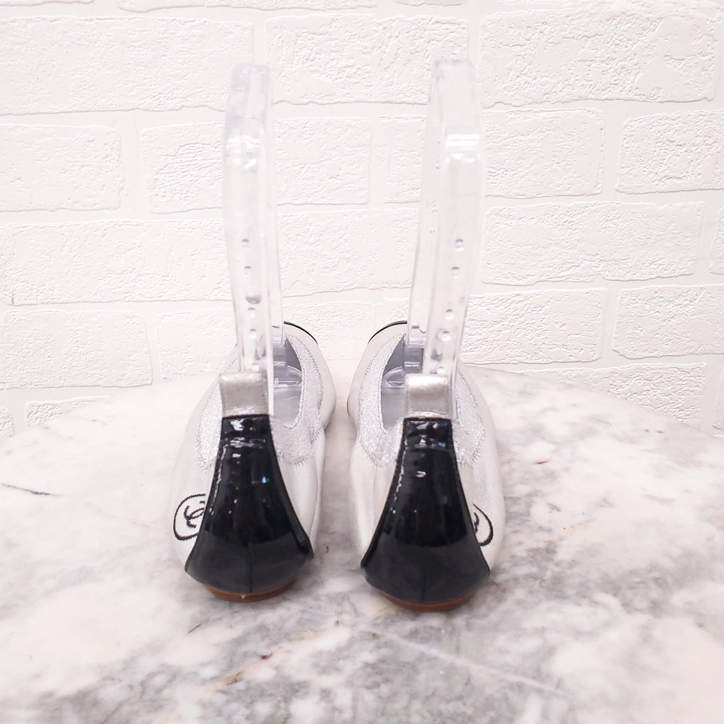 CHANEL METALLIC SILVER LOGO ELASTIC FLATS - SIZE 40
