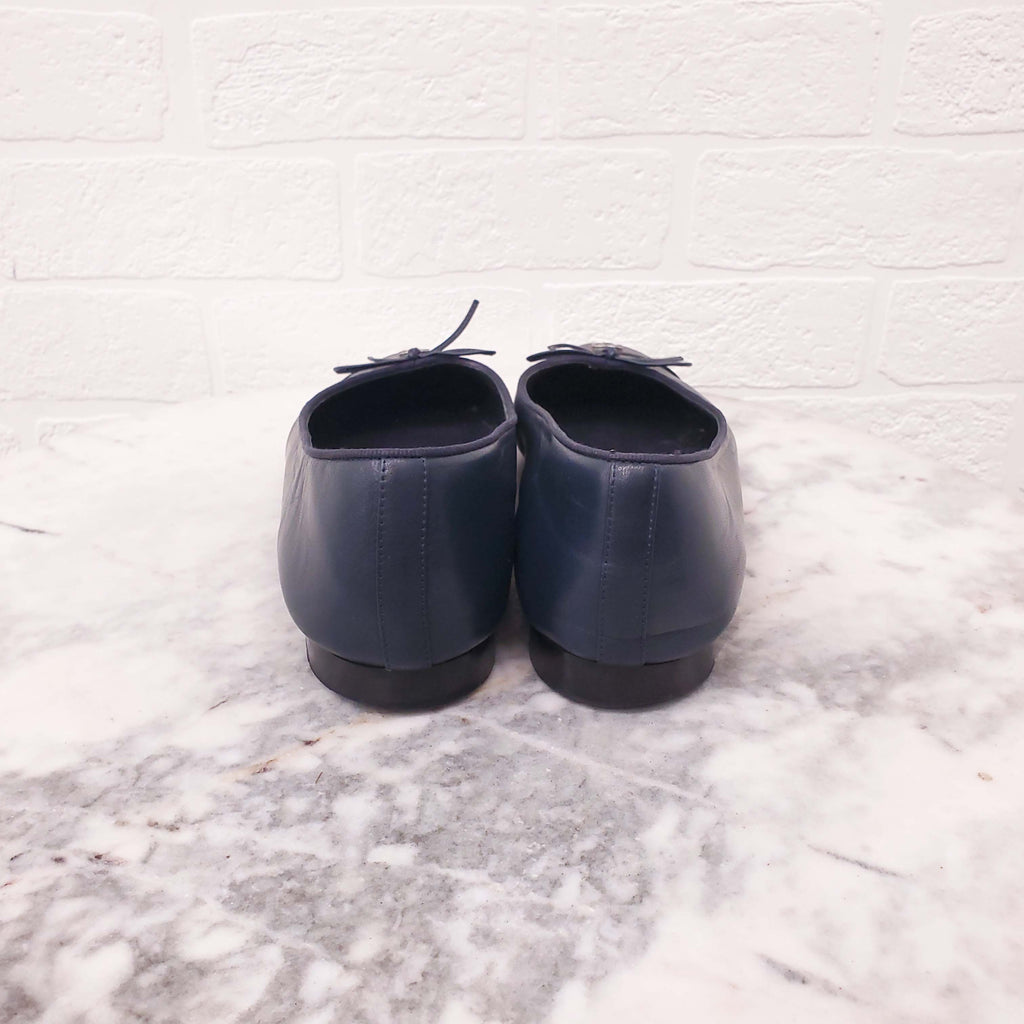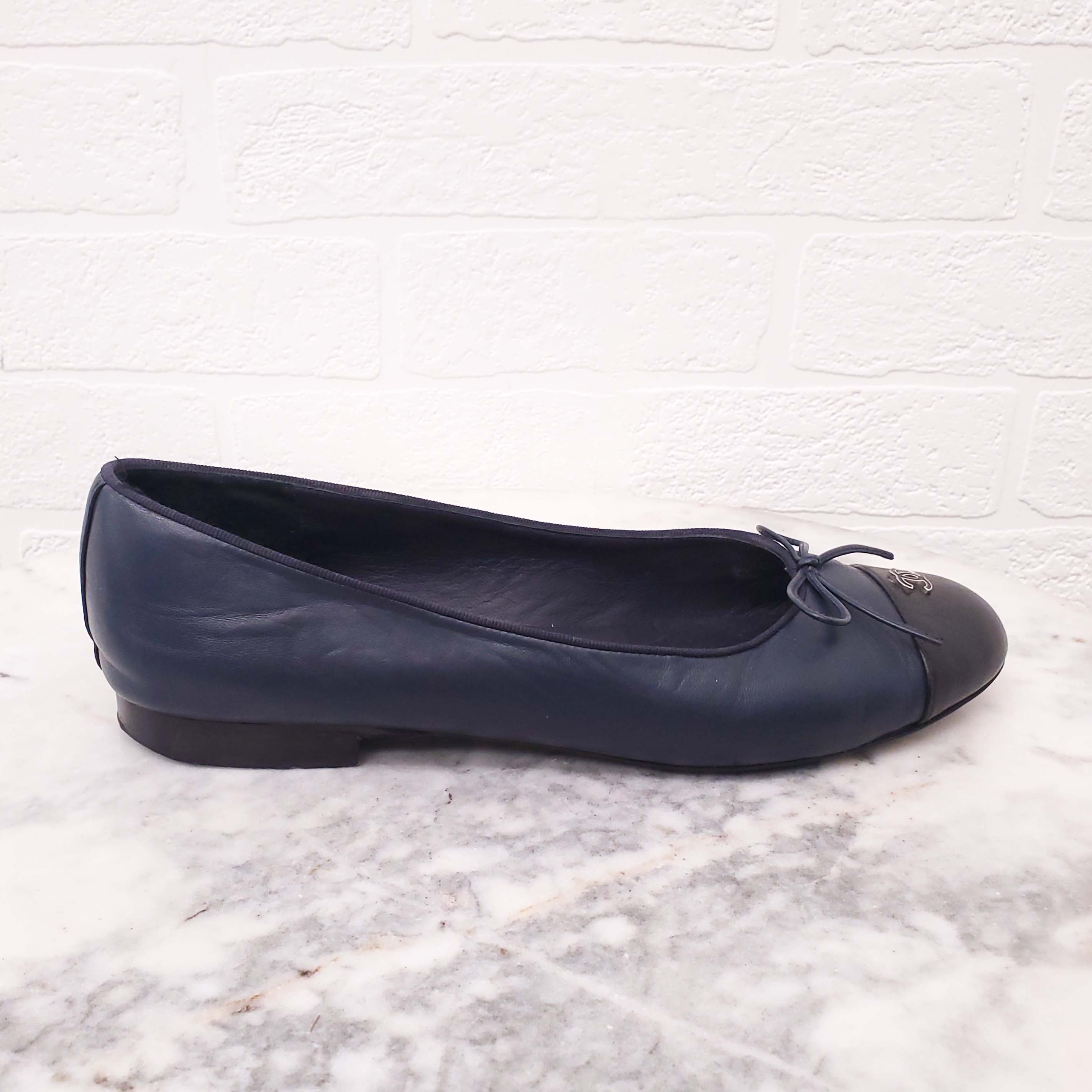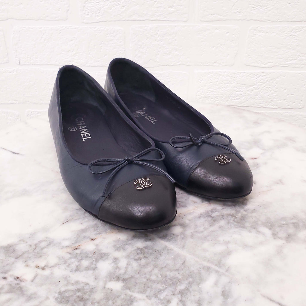 CHANEL NAVY AND BLACK LEATHER LOGO BALLET FLATS - SIZE 39.5
